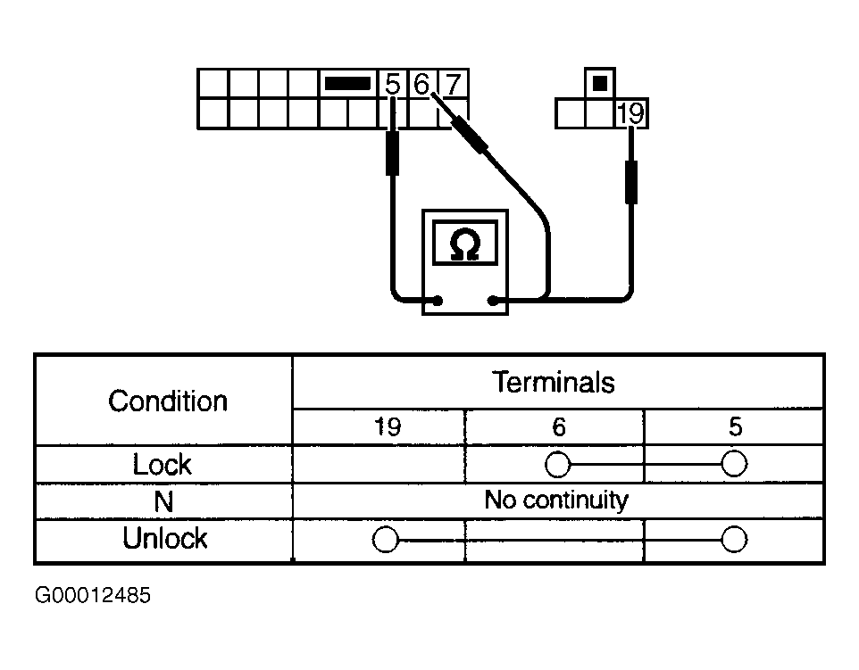 - Disconnect driver's door lock/unlock switch connector. Check continuity between specified terminals. See Fig 1