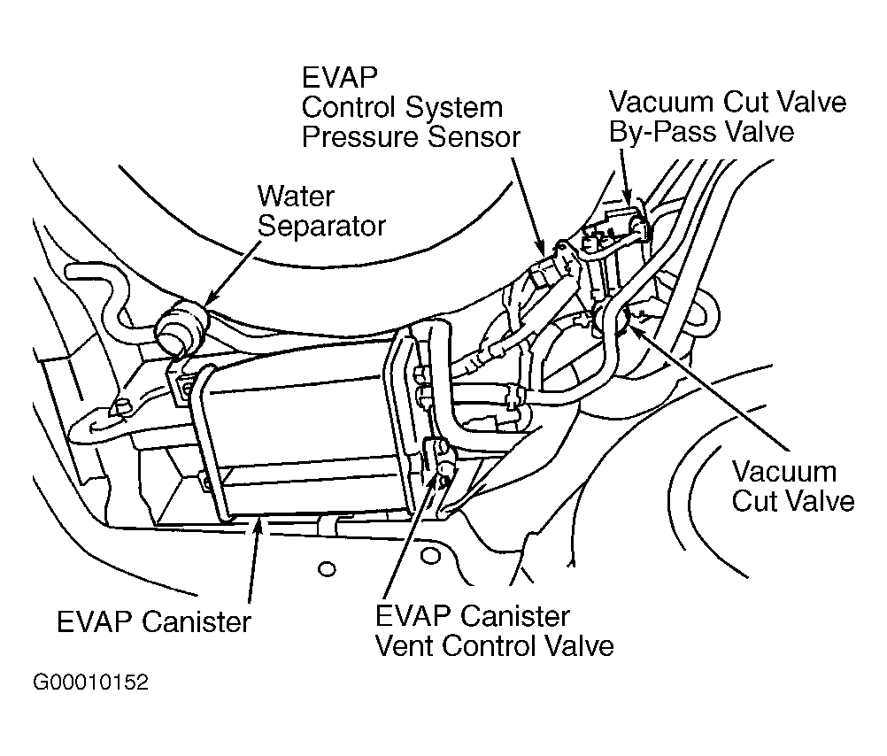 Using EVAP Service Port Adapter (J41413-OBD), connect suitable pressure pump with gauge to EVAP service port. See VACUUM DIAGRAMS article for location. Disconnect EVAP Canister Vent Control Valve (EVAP-CVCV) and vacuum cut valve by-pass valve harness connectors. See Fig 1 or Fig 2 . Using jumper wires, apply battery voltage to EVAP-CVCV and Vacuum cut valve by-pass valve terminals. Apply.2-.4 psi (1.38-2.76 kPa) of pressure to EVAP service port. Remove pressure pump from EVAP service port. Using Leak Detector (J41416), locate EVAP system leak.