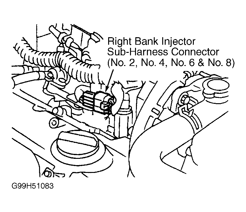 - Turn ignition off. Reconnect right bank injector sub-harness connector. Disconnect all right bank injectors and ECM harness connectors. See Figure. Check continuity of the following: