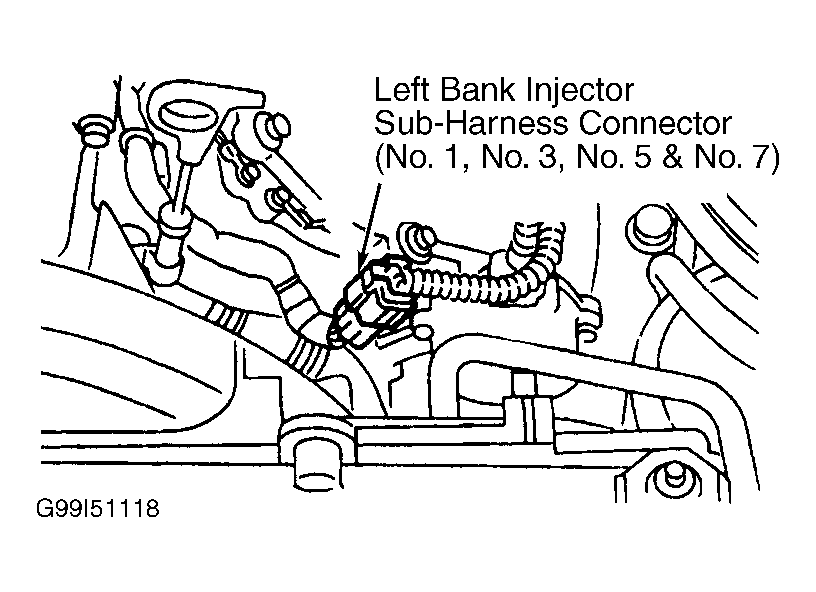 - Turn ignition off. Disconnect injector sub-harness connectors. See Fig 1 and Fig 2 . Turn ignition on. Measure voltage between ground and right bank injector sub-harness connector terminal No. 4 (White wire). Measure voltage between ground and left bank injector sub-harness connector terminal No. 5 (White wire). If battery voltage exists, go to next step. If battery voltage does not exist, repair open or short circuit and retest system. See appropriate wiring diagram in WIRING DIAGRAMS article.