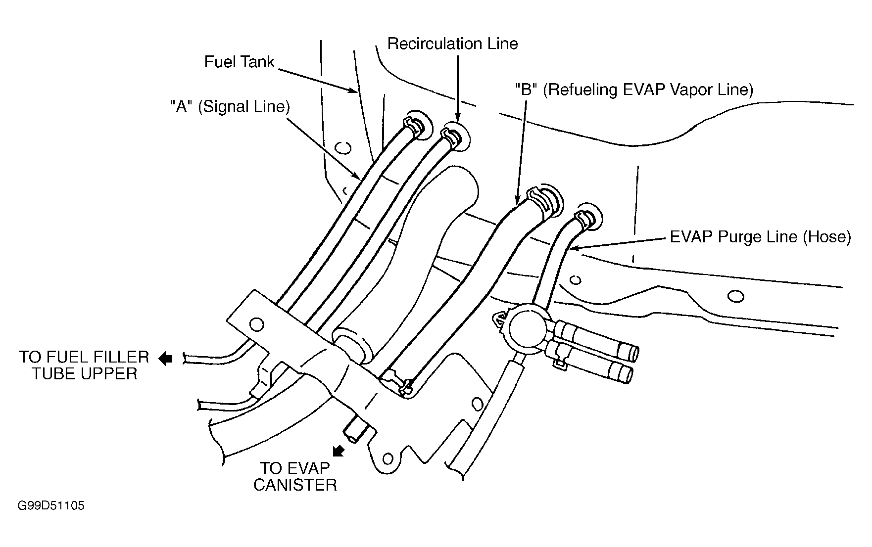 Remove fuel filler cap. Blow air into hose "B". See Fig 1 or Fig 2 . Air should flow freely into fuel tank. Blow air into hose "A". Air should not flow. Using a hand pressure pump with a vacuum "T", apply 2.9 psi (.02 kg/cm2 ) pressure to hoses "A" and "B". Air should not escape. If operation is not as specified, replace fuel tank and control valve. If operation is as specified, test is complete.