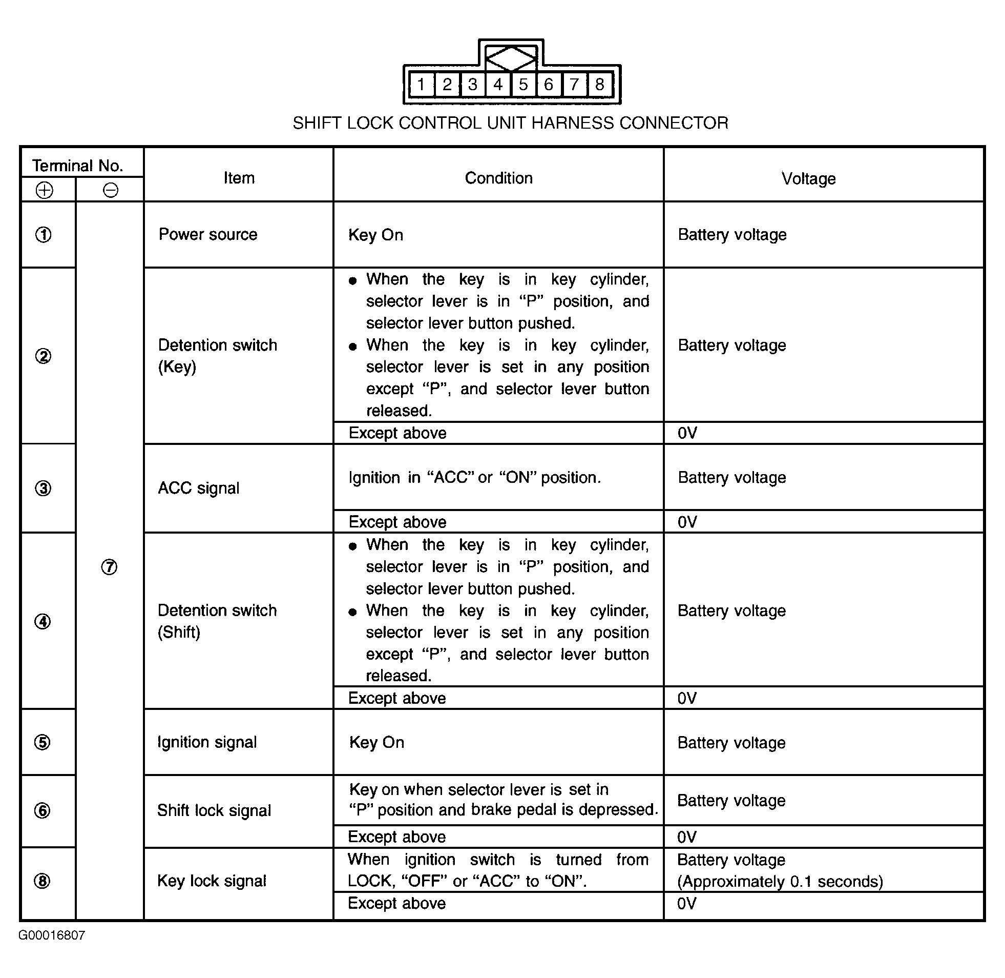 Using DVOM, backprobe Shift Lock Control Unit (SLCU) connector. Measure voltage between SLCU terminals. See Fig 1 .