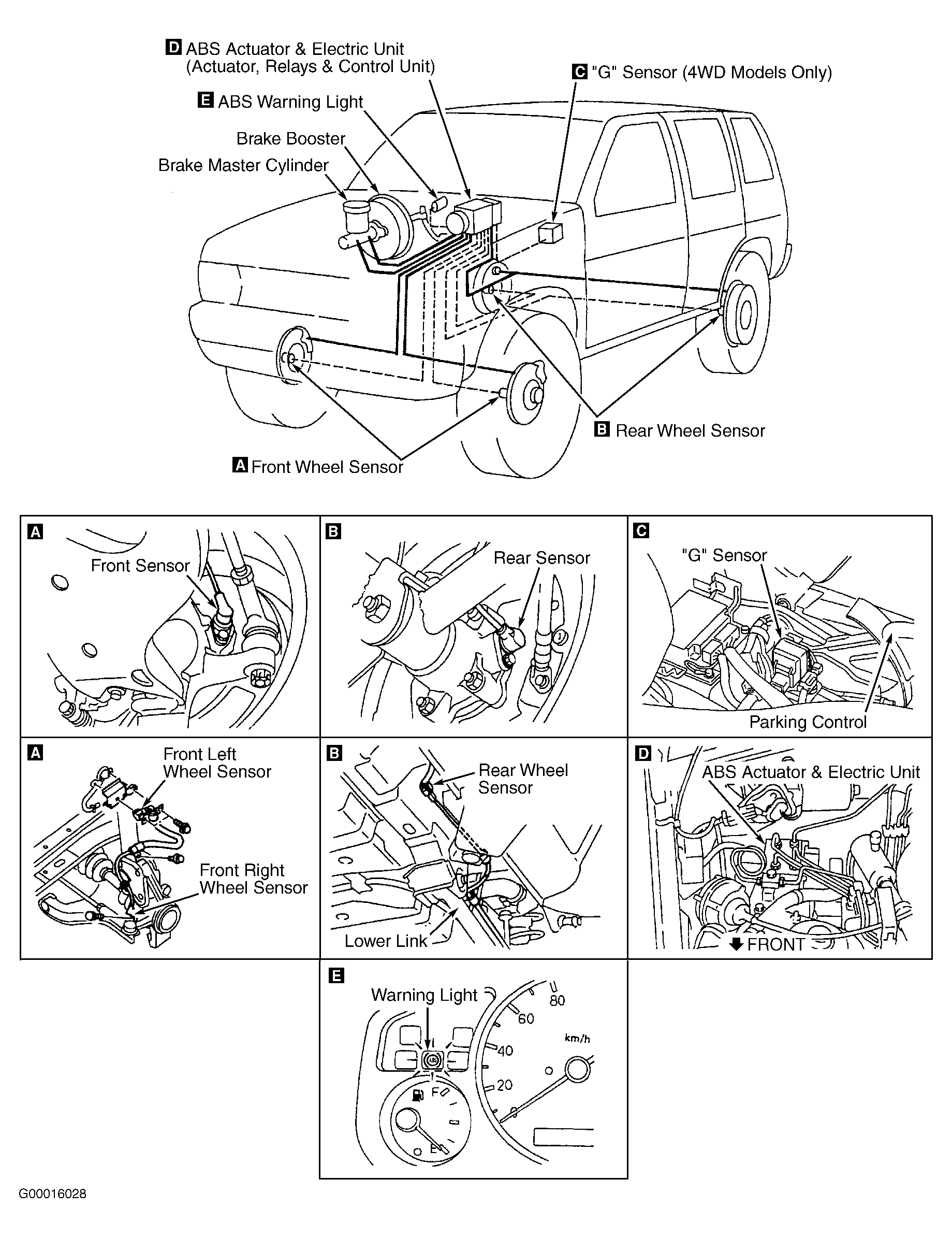Anti-Lock Brake System (ABS) prevents wheel lock-up, allowing driver to maintain steering control during heavy braking. The system consists of an ABS control unit with self-diagnosis capability, "G" sensor (4WD models only), warning light, wheel speed sensors, wiring and hydraulic lines. See Fig 1 .