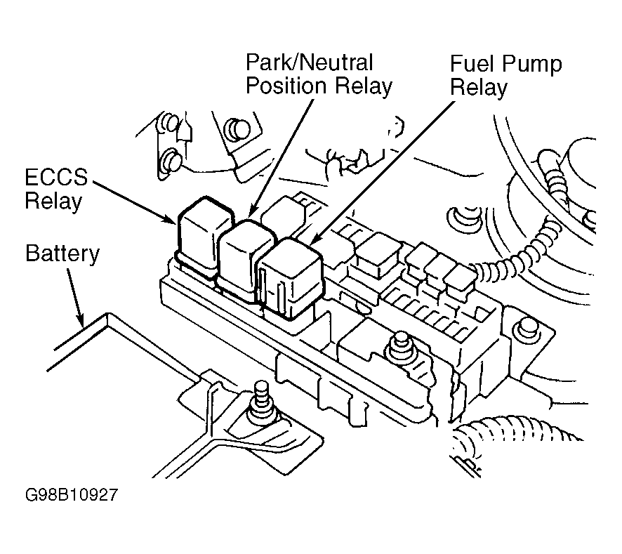- Turn ignition off. Remove ECCS relay. See Fig 2. Check voltage between ground and fuse block relay cavities No. 1 and 7 (White/Red wires). If voltage exists, go to next step. If voltage does not exist, check 7.5-amp fuse and harness for open or short between relay and battery.
