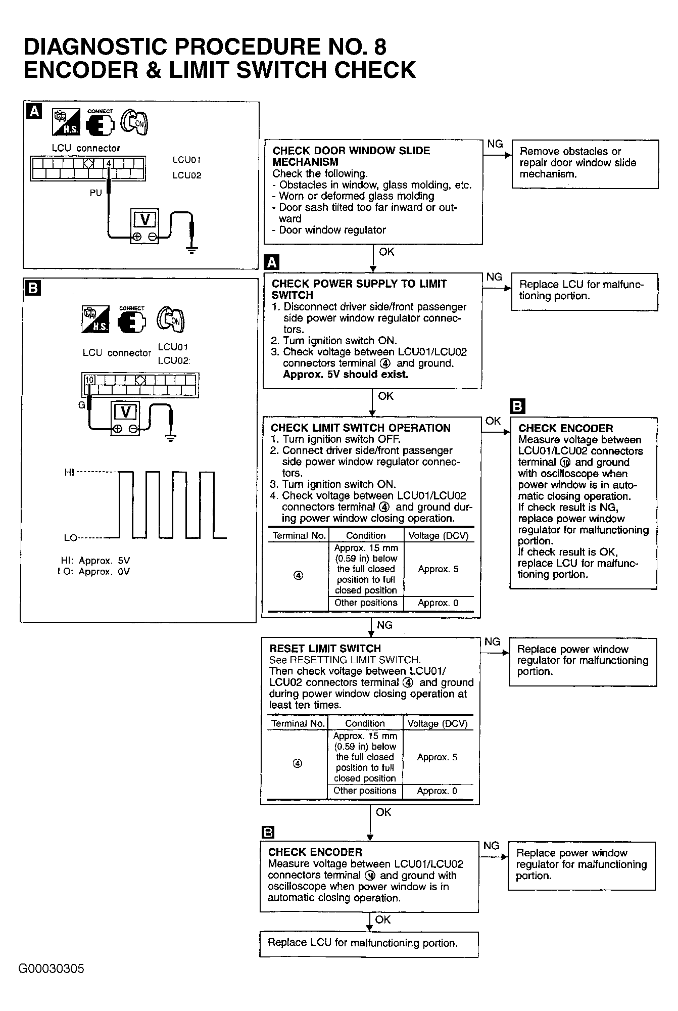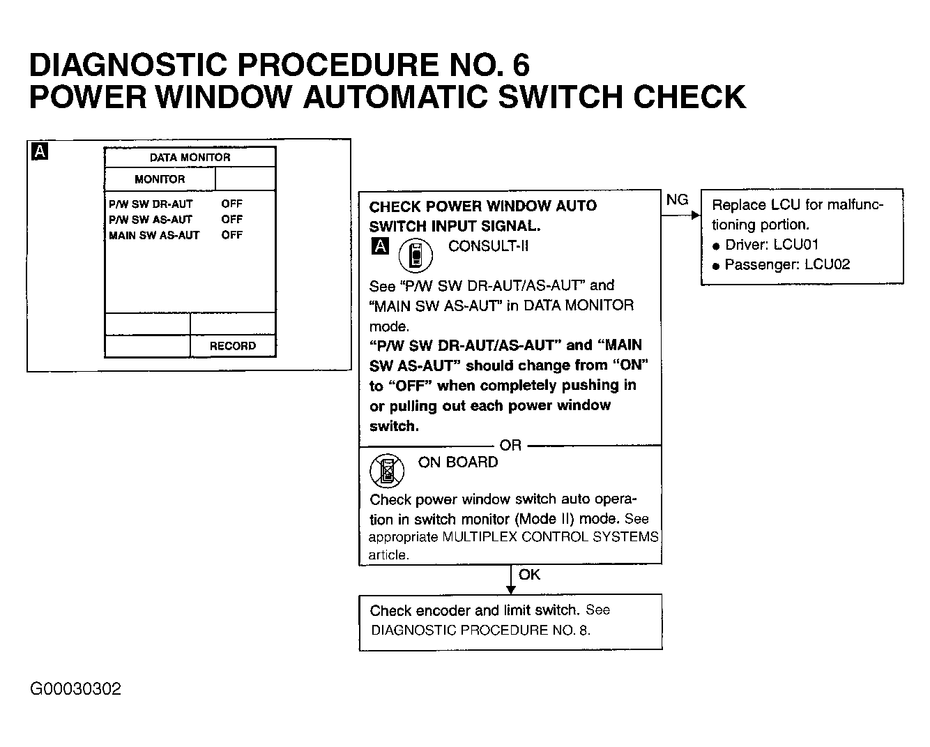 5. If power window automatic function operates, power window system is okay at this time. If power window automatic function does not operate, perform DIAGNOSTIC PROCEDURE 6: POWER WINDOW AUTOMATIC SWITCH CHECK and DIAGNOSTIC PROCEDURE NO. 8: POWER WINDOW ENCODER & LIMIT SWITCH CHECK under DIAGNOSTIC TESTS. See Figure and Figure .