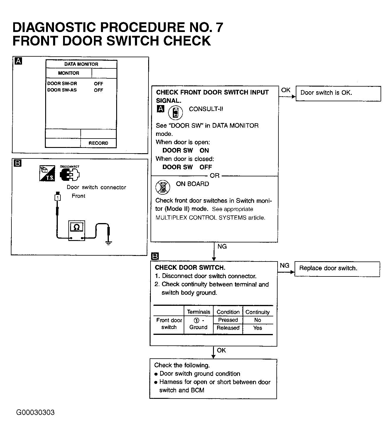 6. Turn ignition off. Operate power windows. If power window power delay function operates for 45 seconds, power window system is currently okay. If power window automatic power delay function does not operate, perform DIAGNOSTIC PROCEDURE NO. 7: POWER WINDOW FRONT DOOR SWITCH CHECK under DIAGNOSTIC TESTS. See Figure .