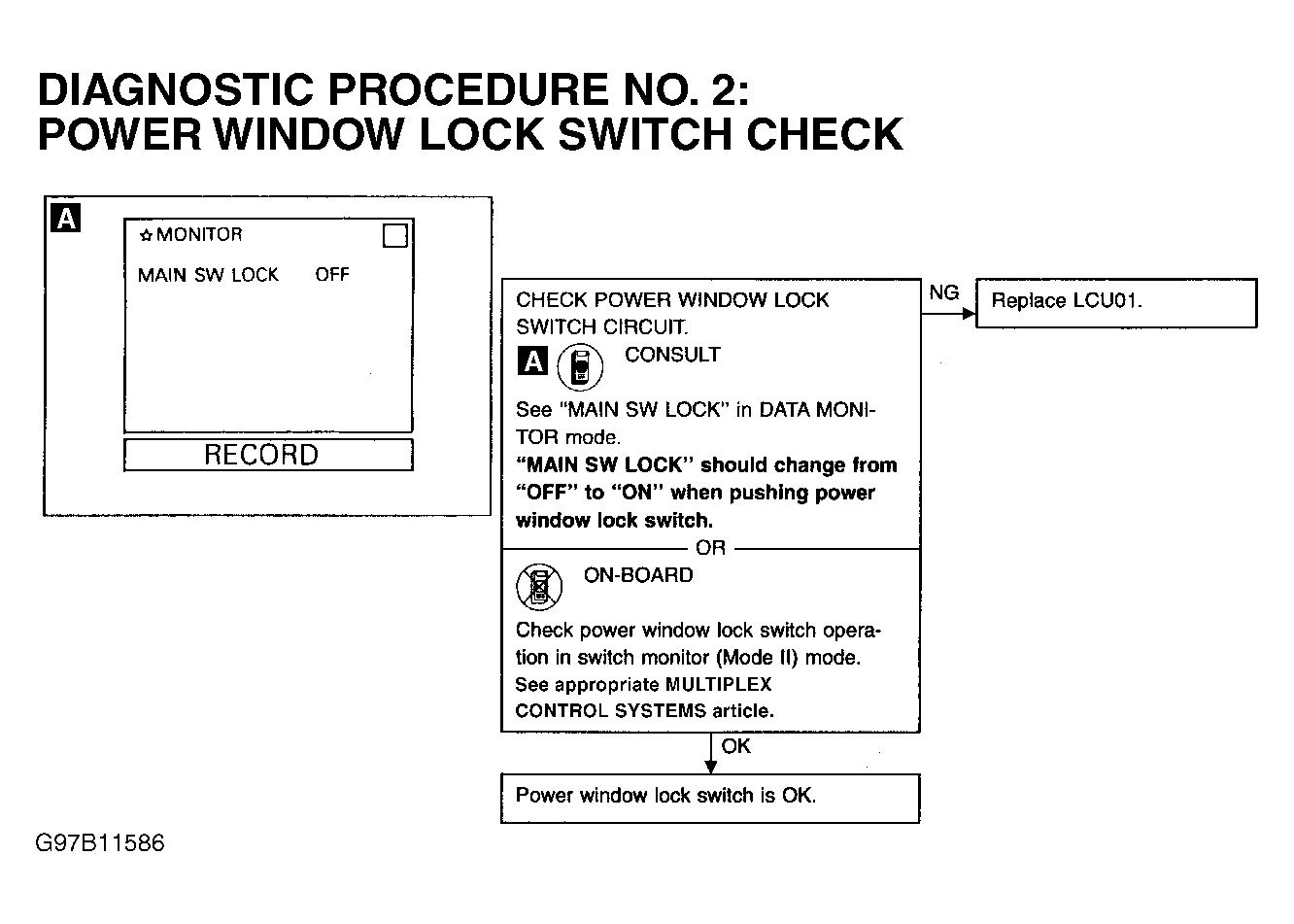 3. Check power window lock switch operation. When power window lock switch is in LOCK position, all power windows should be inoperative, except for driver's window. When in UNLOCK position, all power windows should be operative from all independent window switches. If power window lock switch operation is normal, go to step  5 . If power window lock switch is inoperative, perform DIAGNOSTIC PROCEDURE 2: POWER WINDOW LOCK SWITCH CHECK under DIAGNOSTIC TESTS. See Figure .