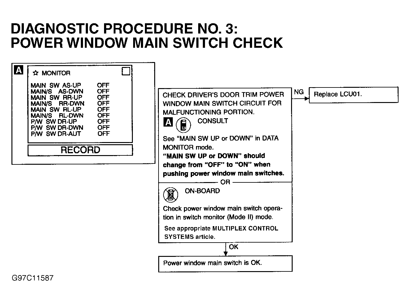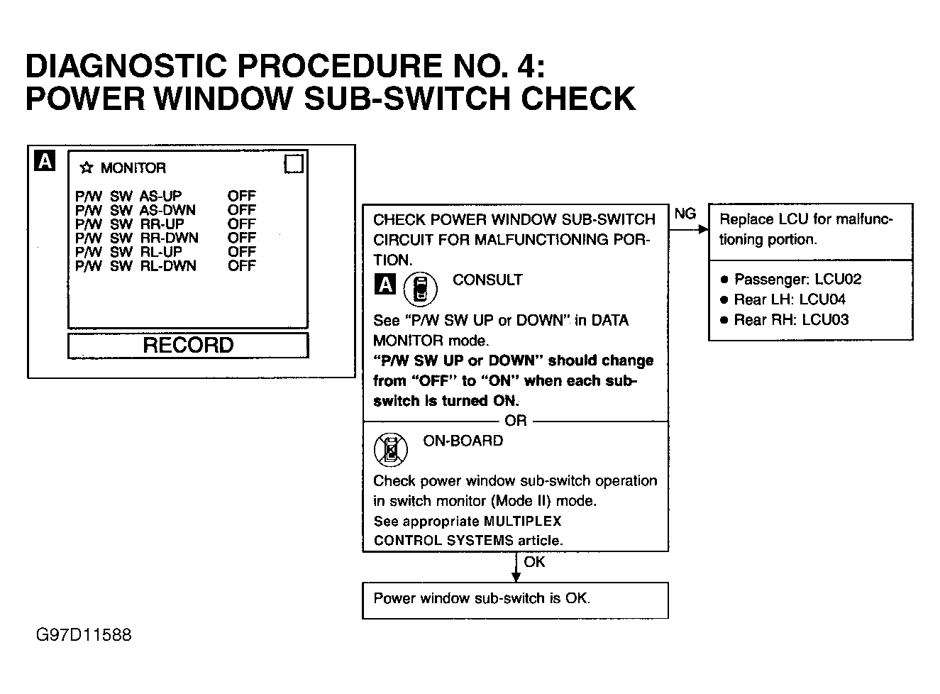 4. If affected power windows do not operate from main switch or independent window switch, perform DIAGNOSTIC PROCEDURE 5: POWER WINDOW REGULATOR CHECK under DIAGNOSTIC TESTS. See Figure . If affected power windows do not operate only when using its independent window switch, perform DIAGNOSTIC PROCEDURE 4: POWER WINDOW SUB-SWITCH CHECK under DIAGNOSTIC TESTS. See Figure . If affected power windows do not operate from main switch only, perform DIAGNOSTIC PROCEDURE 3: POWER WINDOW MAIN SWITCH CHECK under DIAGNOSTIC TESTS. See Figure .