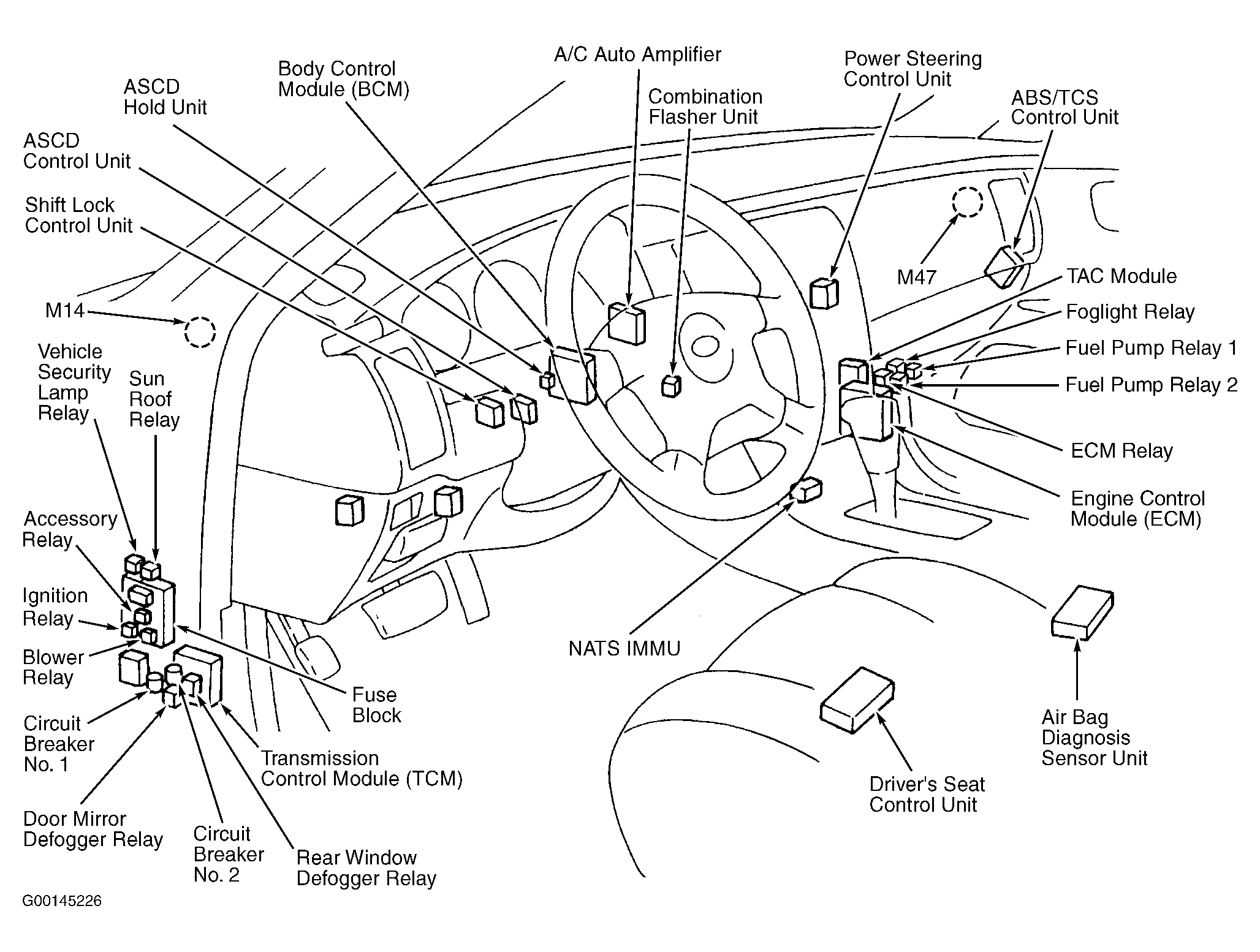 | ASCD Control Unit | Behind dash, left of steering column. See Figure . |