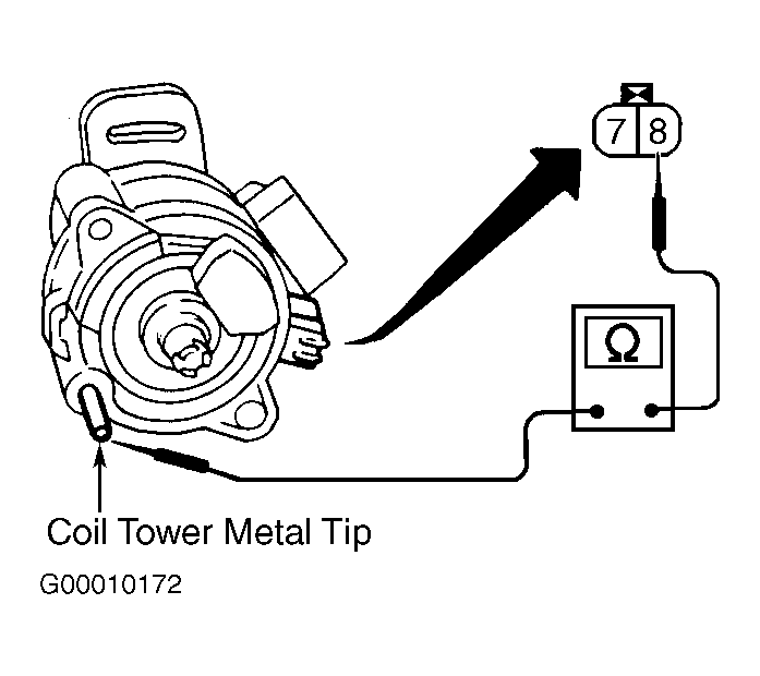 - Measure resistance between distributor 2-pin connector terminals. Also measure resistance between ignition coil tower and distributor 2-pin connector terminal No. 8. See Fig 2. See IGNITION COIL RESISTANCE table. If resistance is as specified, go to next step. If resistance is not as specified, replace distributor assembly and retest system.