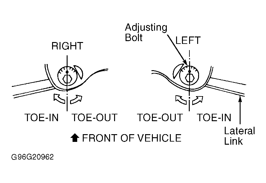 Ensure camber is correct. Bounce both ends of vehicle several times to settle suspension. Measure toe-in. See WHEEL ALIGNMENT SPECIFICATIONS . Adjust toe-in by rotating adjustment bolts. See Fig 1. Toe-in changes about .06" (1.5 mm) per side with each graduation of adjustment pin.
