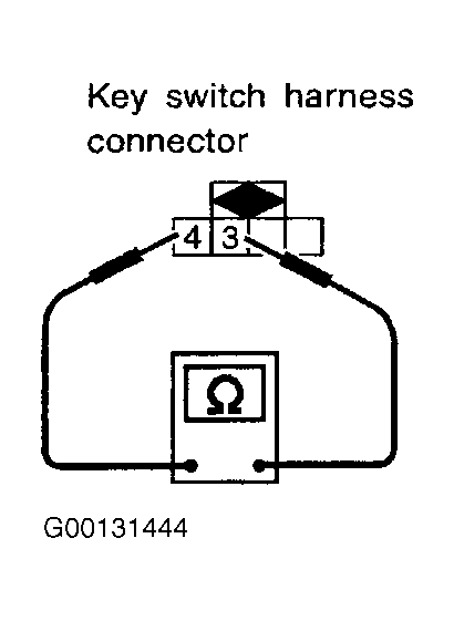 Disconnect key switch harness connector. See Figure . Check for continuity between key switch harness connector terminals No. 3 and 4. See Figure . With key inserted, continuity should exist. With key removed, continuity should not exist. If continuity is not as specified, ensure switch is properly adjusted. Replace as necessary.