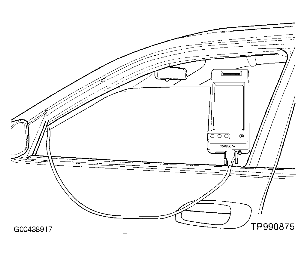 24. Roll down the driver's window part way, exit the vehicle, close the door, and hang the CONSULT II unit on the outside of the window (see Fig 12).