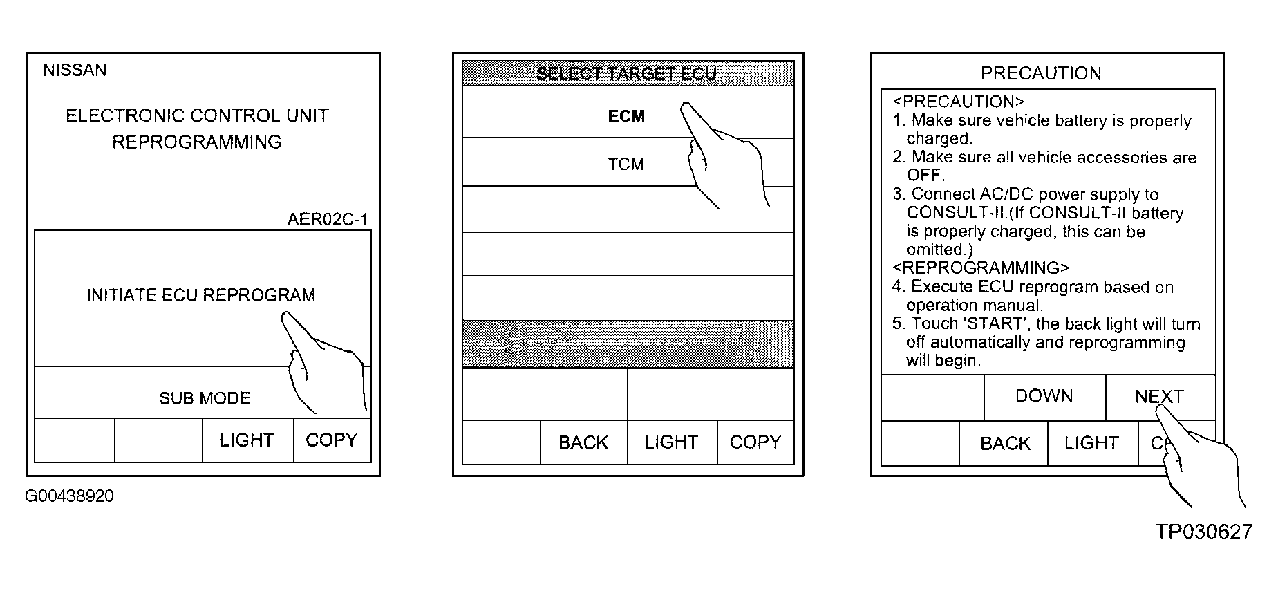 • Do not unplug CONSULT-II from the vehicle during reprogramming. Permanent ECM damage can occur.