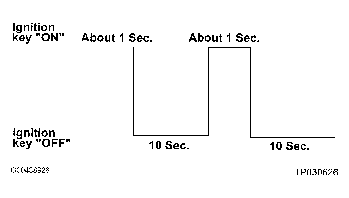 44. Wait more than 10 seconds, then turn the ignition switch "ON" for 1 second. Then, turn the ignition switch "OFF" again for 10 seconds (see  Fig 20 ).