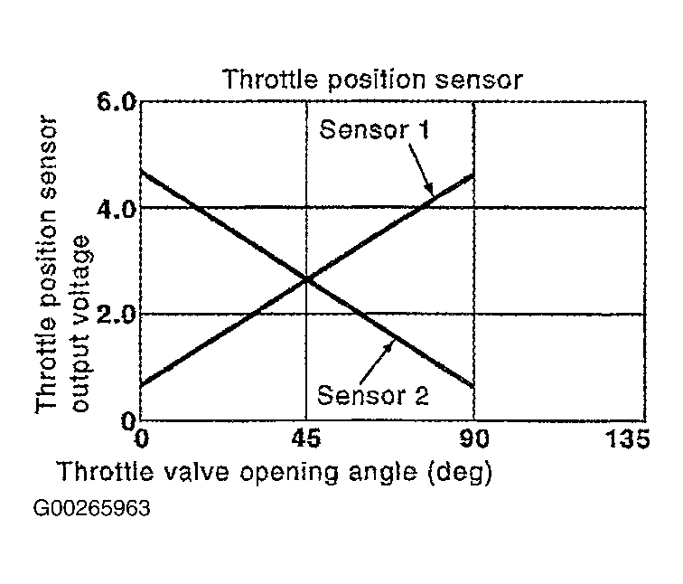 Electric throttle control actuator consists of throttle control motor, throttle position sensor, etc. The throttle position sensor responds to the throttle valve movement. The throttle position sensor has the 2 sensors. These sensors are a kind of potentiometers which transform the throttle valve position into output voltage, and emit the voltage signal to the ECM. See Fig 1. In addition, these sensors detect the opening and closing speed of the throttle valve and feed the voltage signals to the ECM. The ECM judges the current opening angle of the throttle valve from these signals and the ECM controls the throttle control motor to make the throttle valve opening angle correct in response to driving condition.