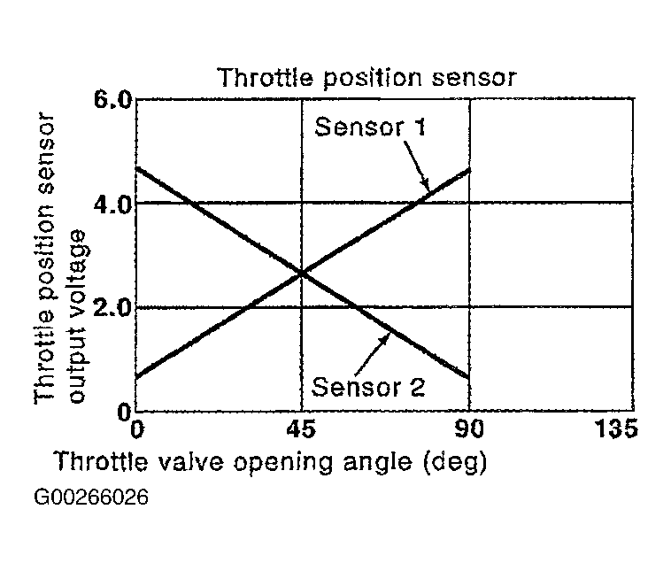 Electric throttle control actuator consists of throttle control motor, throttle position sensor, etc. The throttle position sensor responds to the throttle valve movement. The throttle position sensor has 2 sensors. These sensors are a kind of potentiometers which transform the throttle valve position into output voltage, and emit the voltage signal to the ECM. In addition, these sensors detect the opening and closing speed of the throttle valve and feed the voltage signals to the ECM. The ECM judges the current opening angle of the throttle valve from these signals and the ECM controls the throttle control motor to make the throttle valve opening angle correct in response to driving condition. See Fig 1.