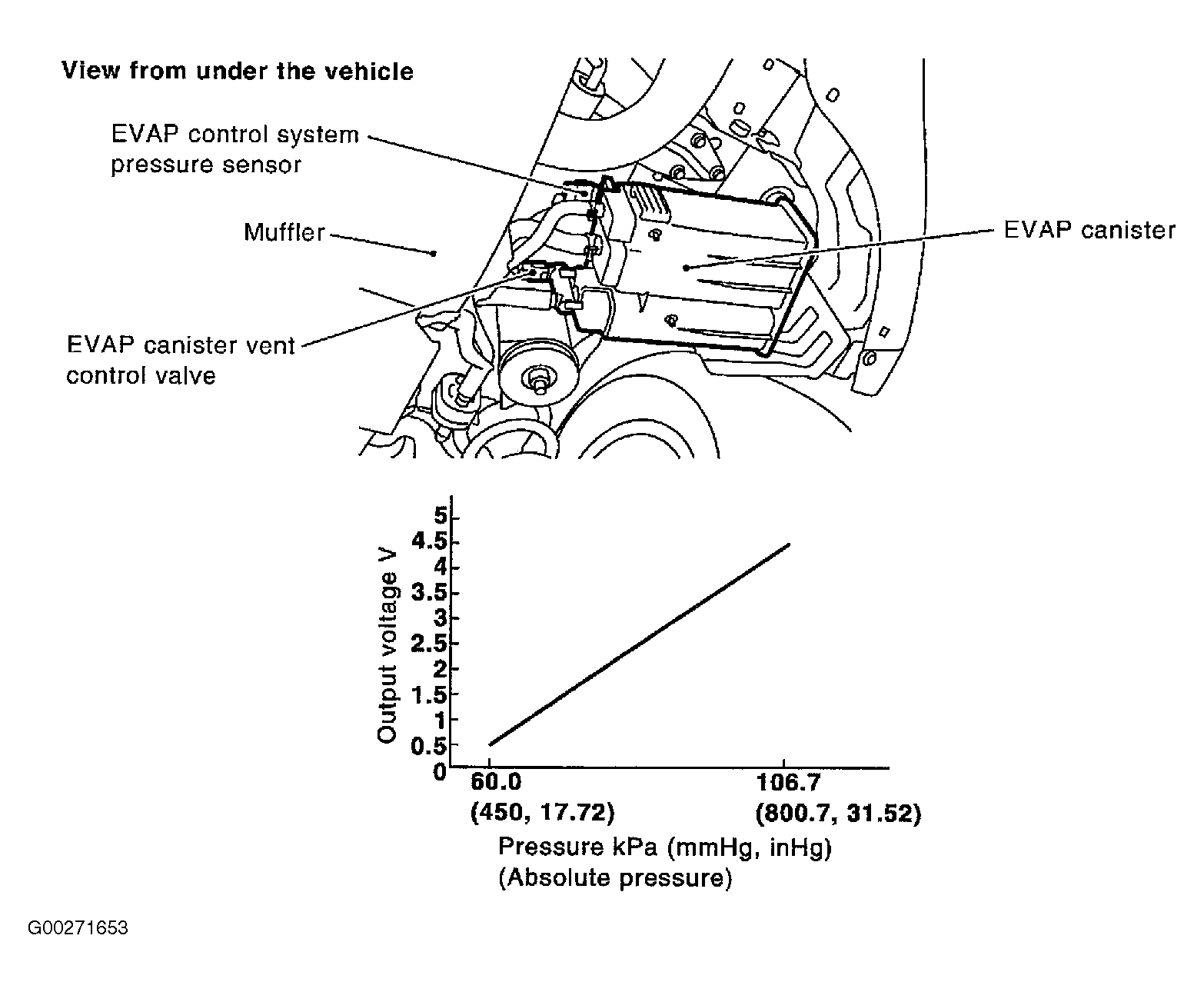 The EVAP control system pressure sensor detects pressure in the purge line. The sensor output voltage to the ECM increases as pressure increases. See Fig 1.