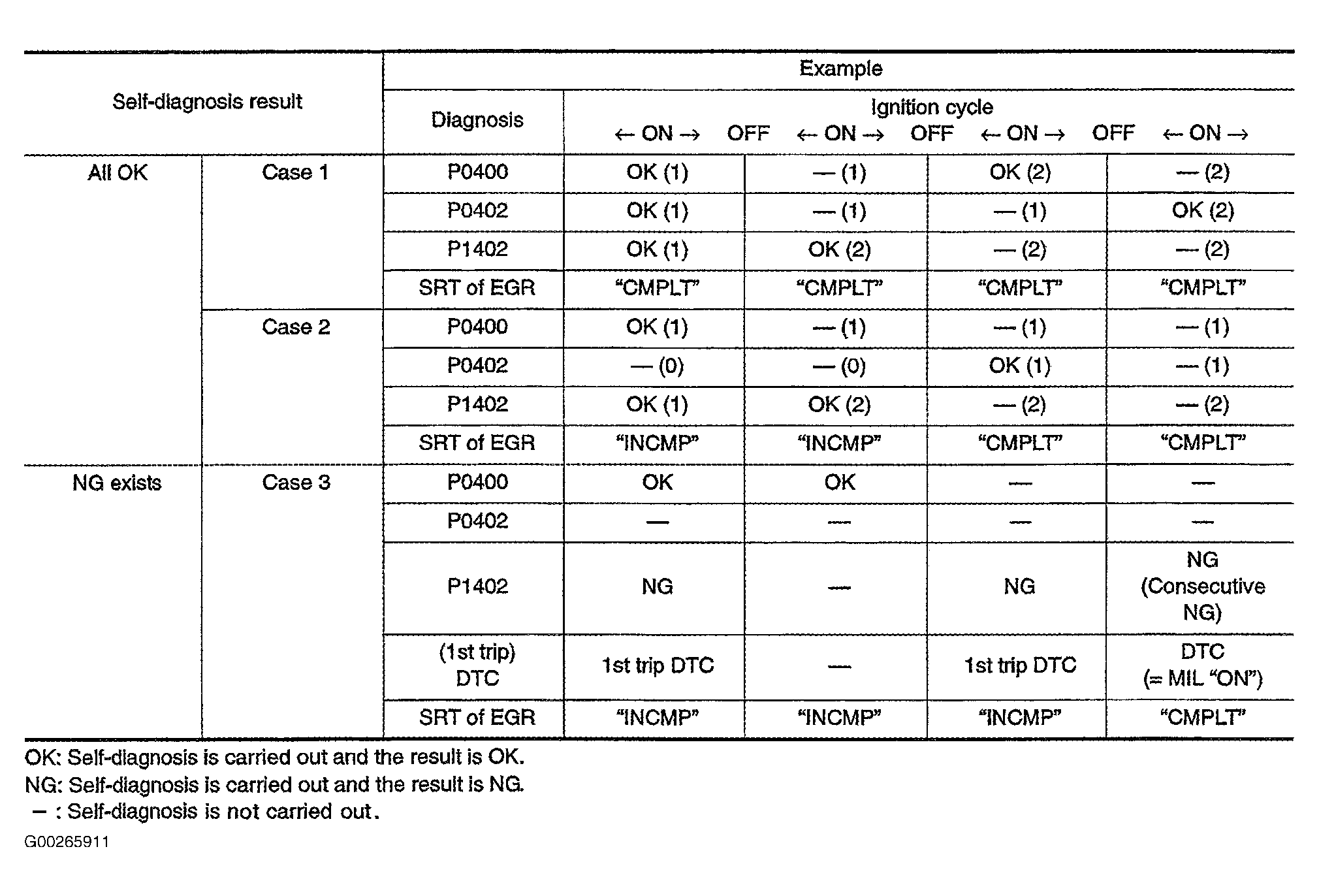 When all SRT related self-diagnostics showed OK results in a single cycle (Ignition OFF-ON-OFF), the SRT will indicate CMPLT. Self-diagnosis results have 3 cases. Case 1: When all SRT related self-diagnostics showed OK results through several different cycles, the SRT will indicate CMPLT at the time the respective self-diagnostics have at least one OK result. Case 2: If one or more SRT related self-diagnostics showed NG results in 2 consecutive cycles, the SRT will also indicate CMPLT. Case 3: The minimum number of cycles for setting SRT as INCMP is one for each self-diagnosis (Case 1 and 2) or 2 for 1 of self-diagnostic (Case 3). However, in preparation for the state emissions inspection, it is unnecessary for each self-diagnostics to be executed twice (Case 3) for the following reasons:
