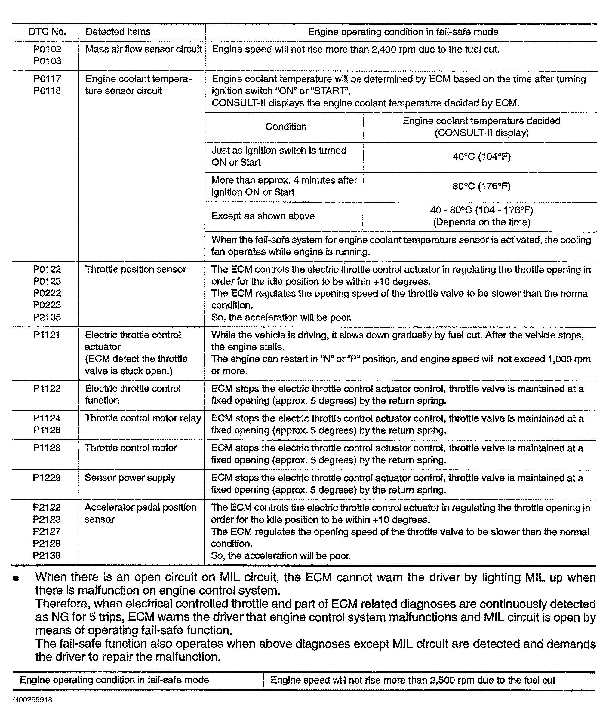 When the DTCs listed are detected, the ECM enters fail-safe mode and the MIL illuminates. See