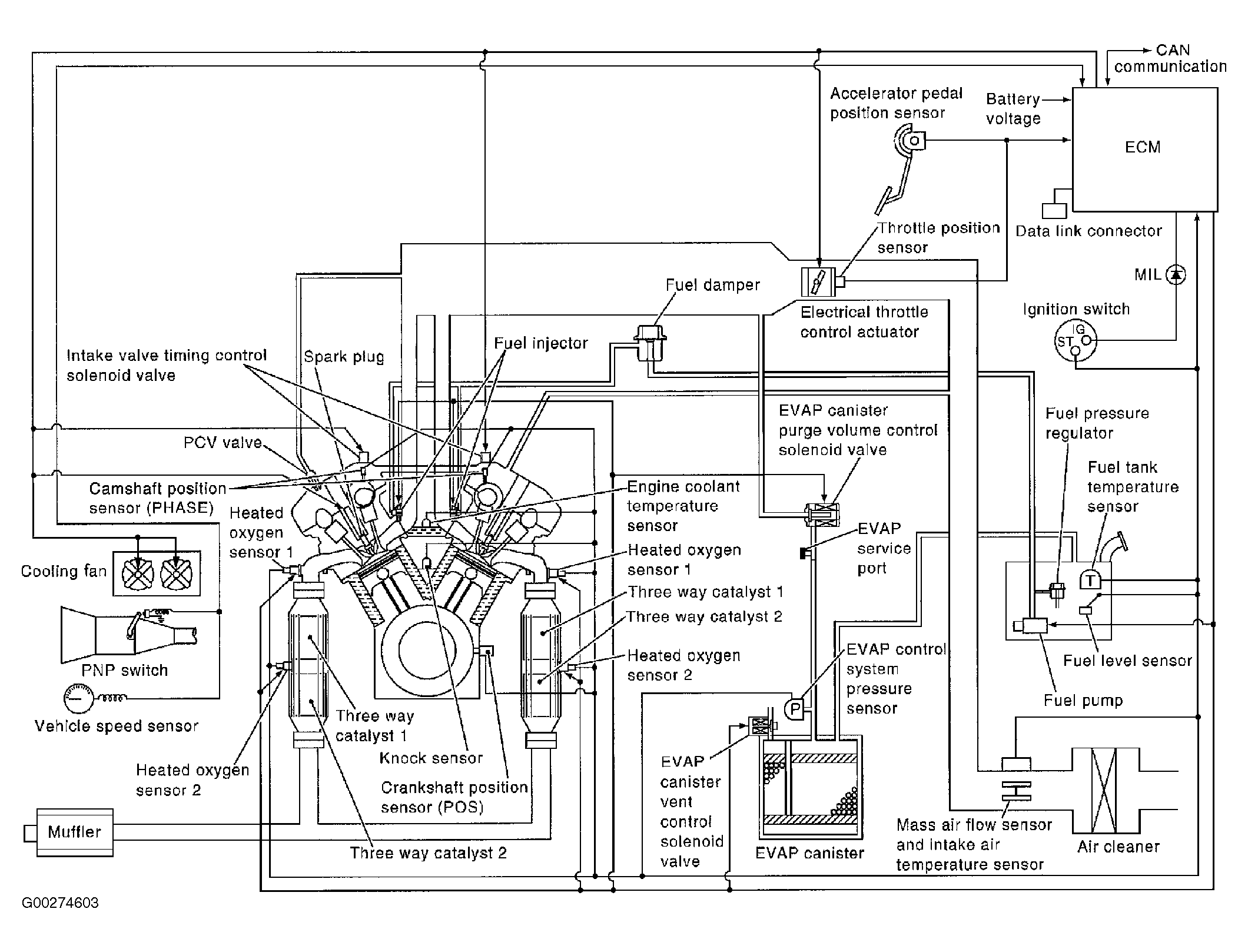 The ECM has an on-board diagnostic system, which detects malfunctions related to engine sensors or actuators. See Fig 1. The ECM also records various emission-related diagnostic information. See Fig 2. The Malfunction Indicator Light (MIL) on the instrument panel illuminates when the same malfunction is detected in 2 consecutive trips (2 trip detection logic), or when the ECM enters fail-safe mode.