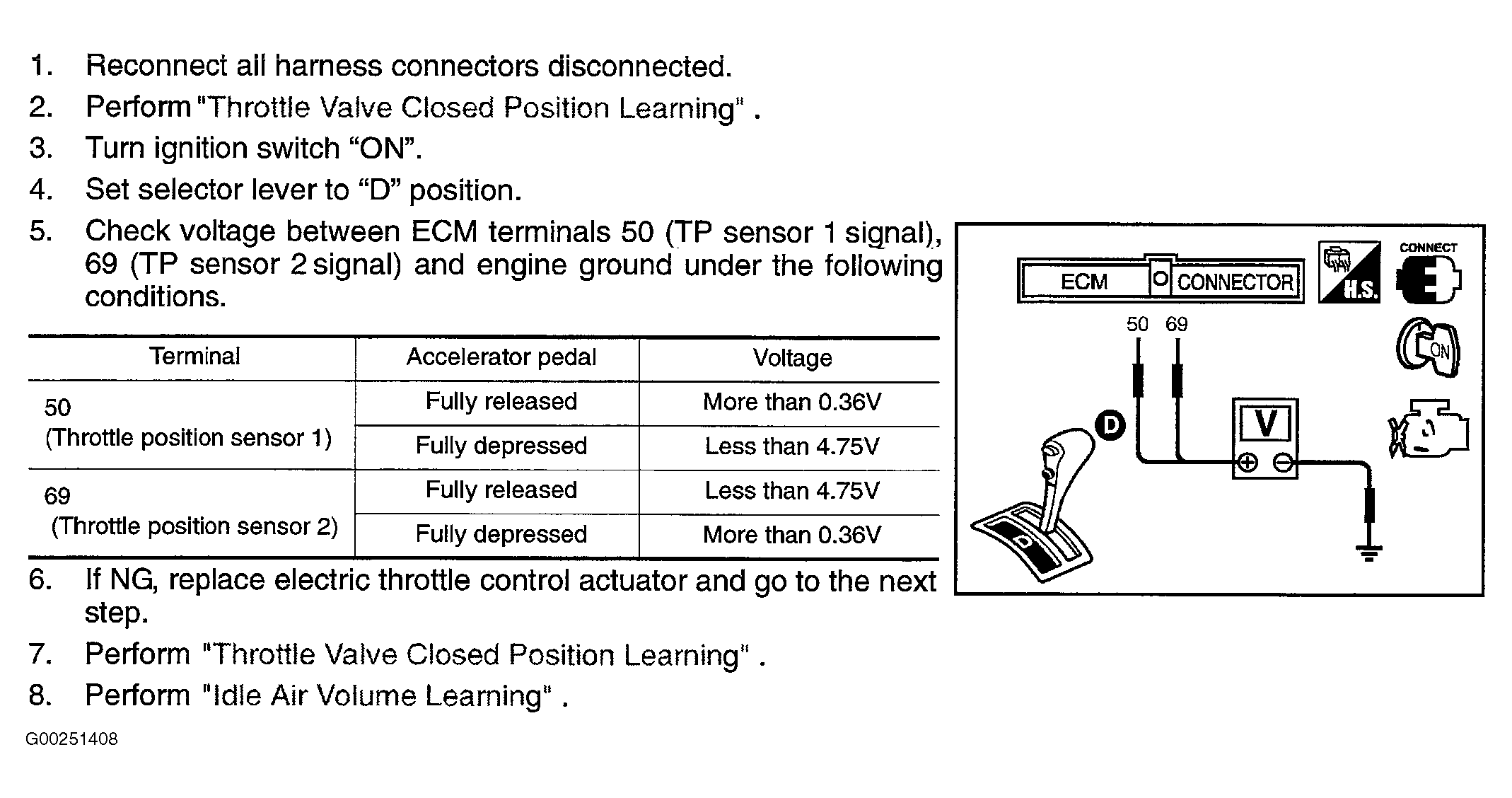 - Perform THROTTLE VALVE CLOSED POSITION LEARNING. See THROTTLE VALVE CLOSED POSITION LEARNING under PROGRAMMING.