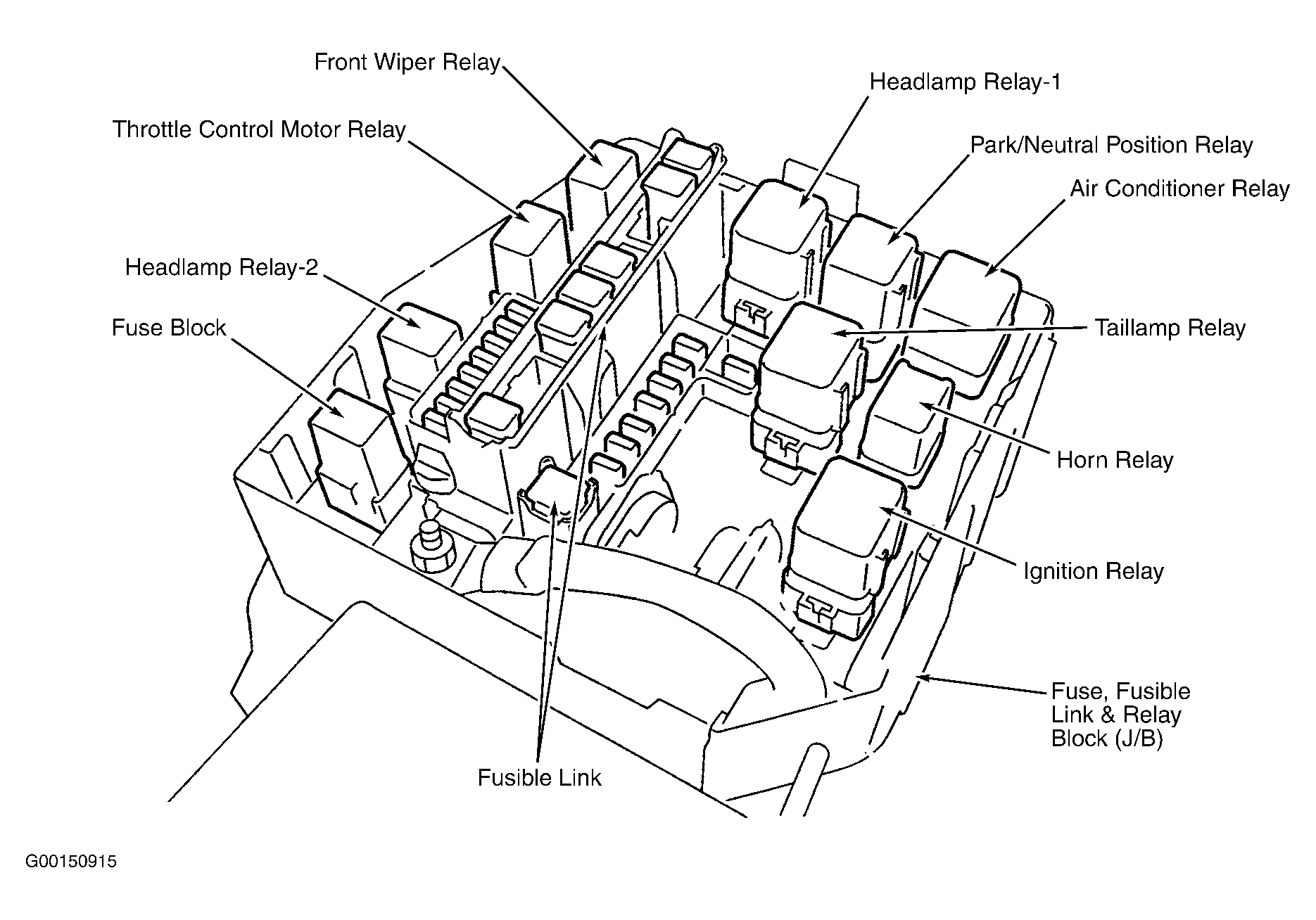 | Fuse Block | In fuse, fusible link & relay block (J/B). See Figure . |