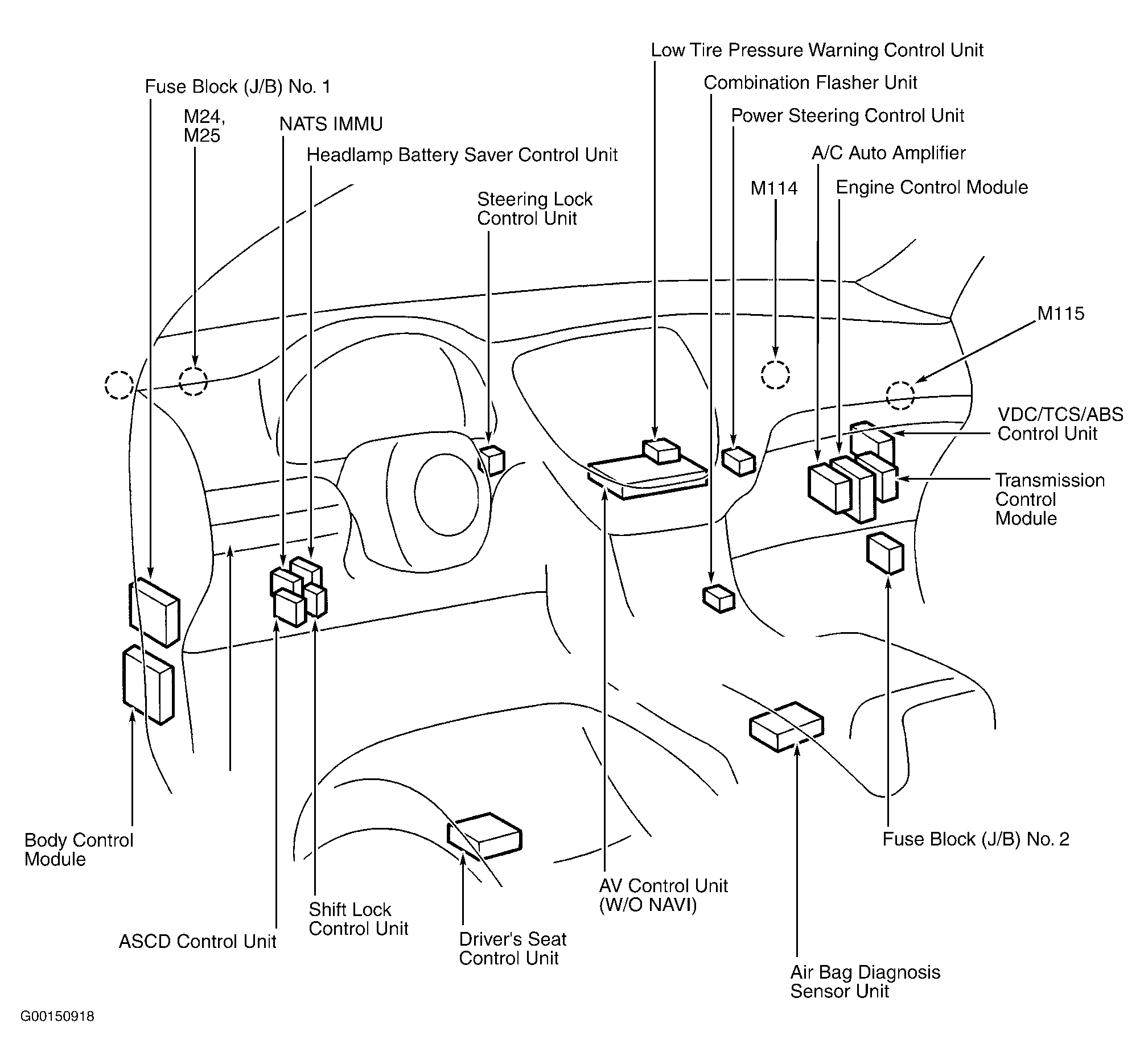 | Fuse Block (J/B) No. 1 | Behind left end of dash. See Figure . |