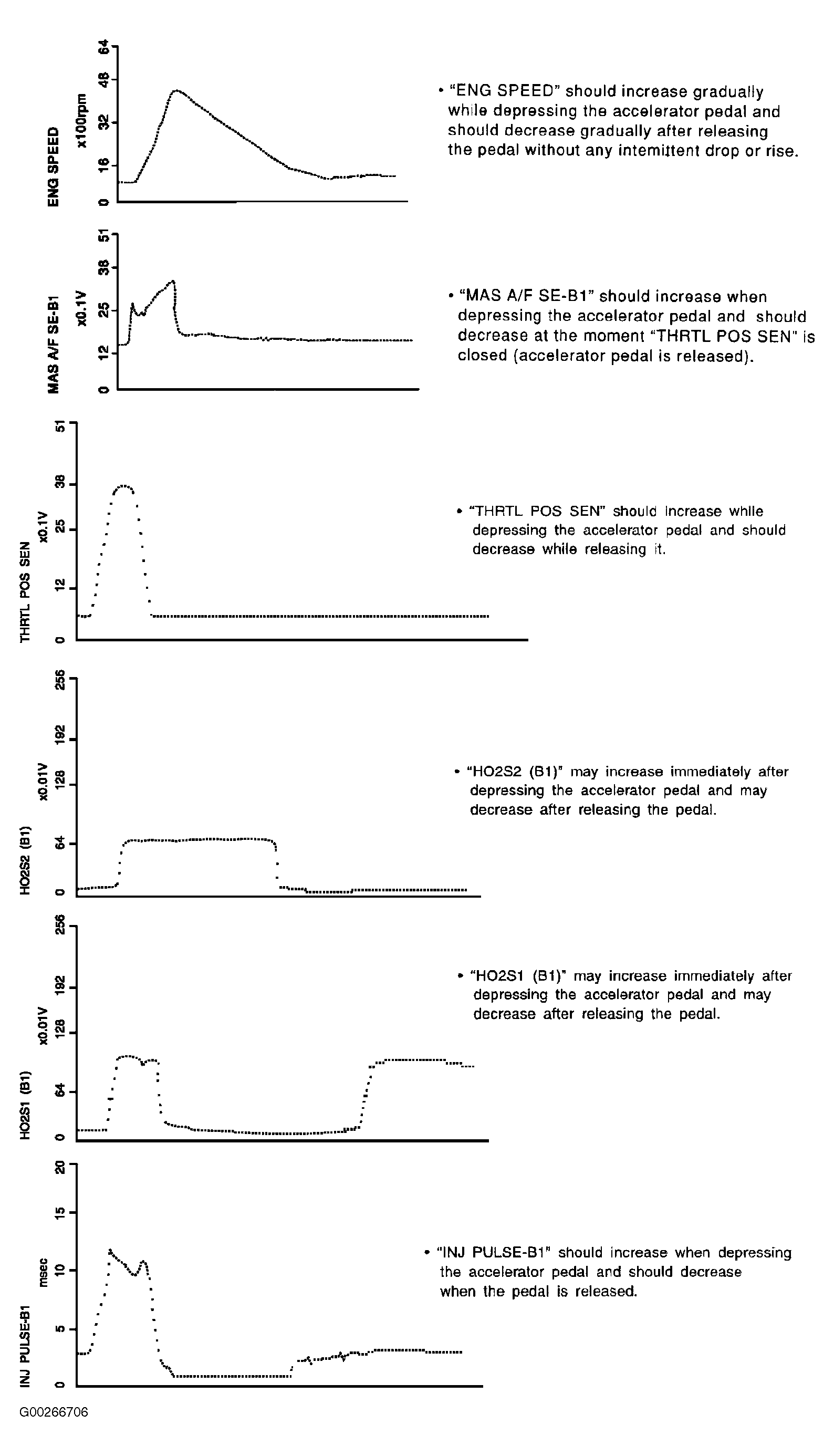 The following illustration shows the data for "CLSD THL POS", "ACCEL SEN 1" and "THRTL SEN 1" when depressing the accelerator pedal with the ignition switch "ON" and with selector lever in "D" position. See Fig 1 . The signal of "ACCEL SEN 1" and "THRTL SEN 1" should rise gradually without any intermittent drop or rise after "CLSD THL POS" is changed from "ON" to "OFF". - ENG SPEED, MAS A/F SE-B1, THRTL POS SEN, HO2S2 (B1), HO2S1 (B1), INJ PULSE-B1