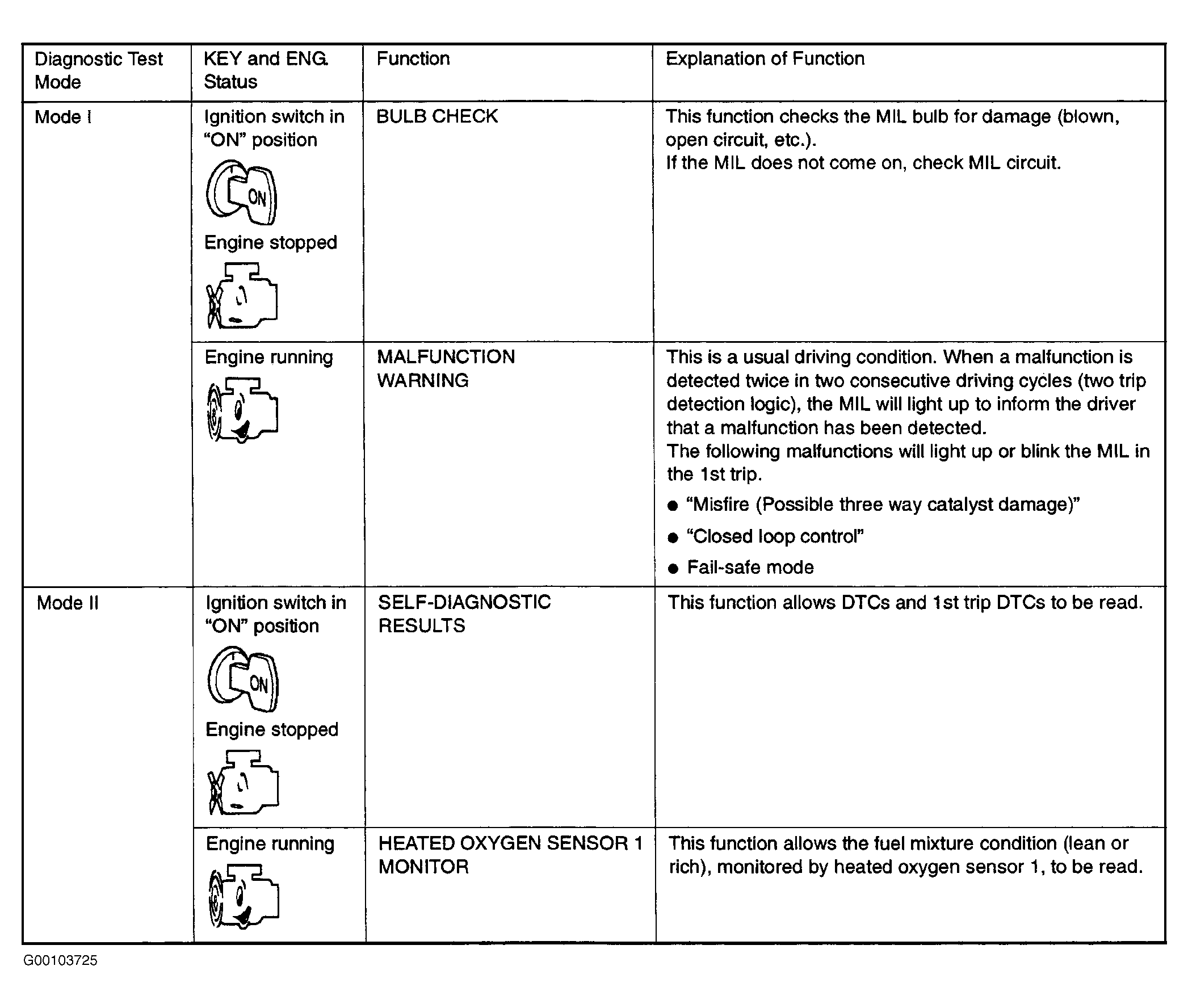 Malfunction Indicator Light (MIL) can be used for DTC retrieval and front Heated Oxygen Sensor (HO2S) monitoring. See Fig 1 . When ignition is turned on with engine off, MIL should illuminate. This is a bulb check. If MIL does not illuminate, repair MIL circuit. See appropriate INSTRUMENT PANELS article in ACCESSORIES & EQUIPMENT or, see DTC P0650: MIL (CIRCUIT) under DIAGNOSTIC TESTS. When engine is started, MIL should go off. If MIL remains on, ECM has detected a malfunction. If MIL is flashing when engine is running, ECM may be in diagnostic test mode II.