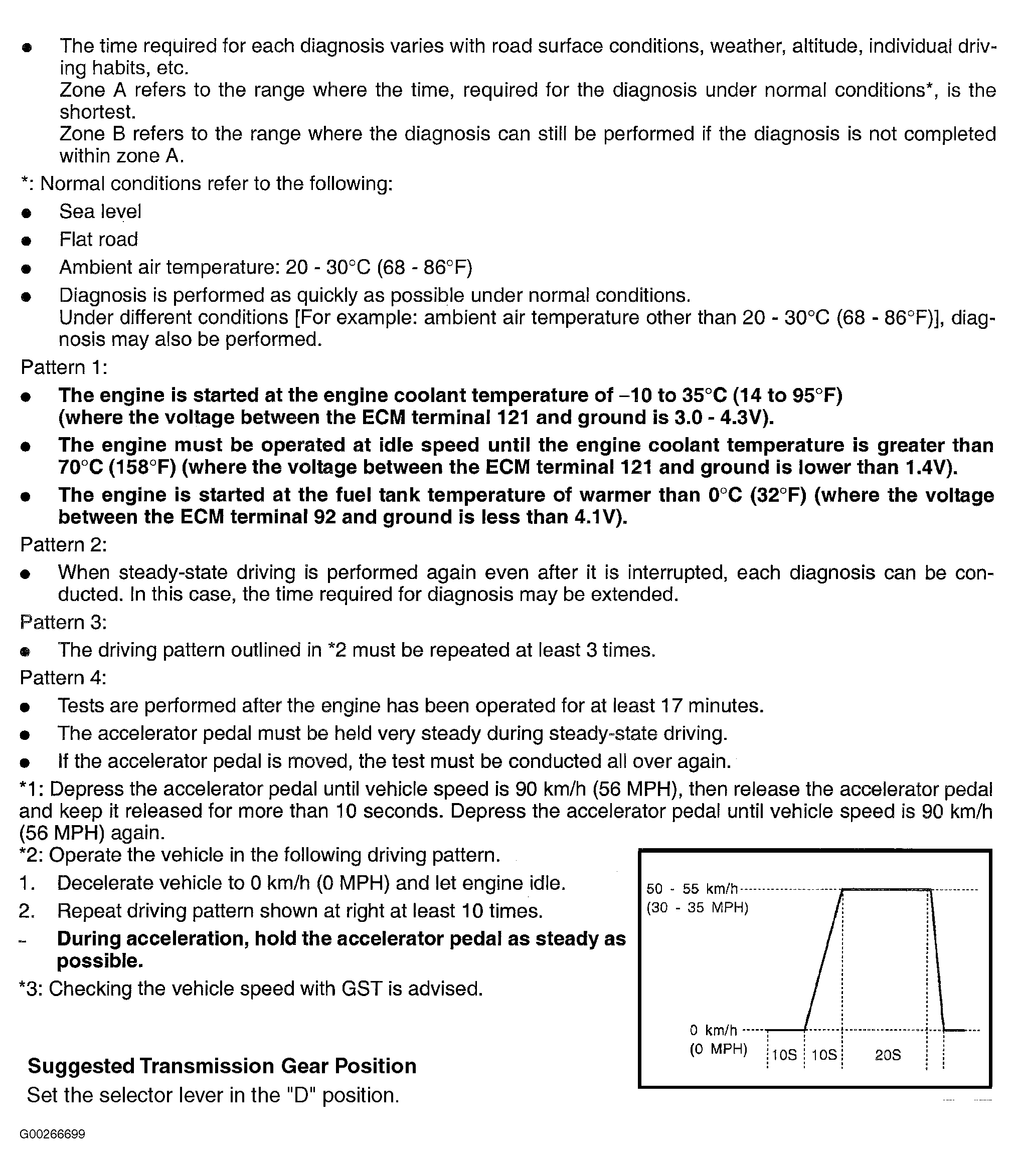 To set all SRT codes as complete, drive vehicle according to procedure shown in illustrations. See Fig 1 and Fig 2 . Perform driving procedure one or more times. If driving procedure is interrupted, repeat procedure. Operate vehicle with shift lever in "D" position and overdrive turned on.