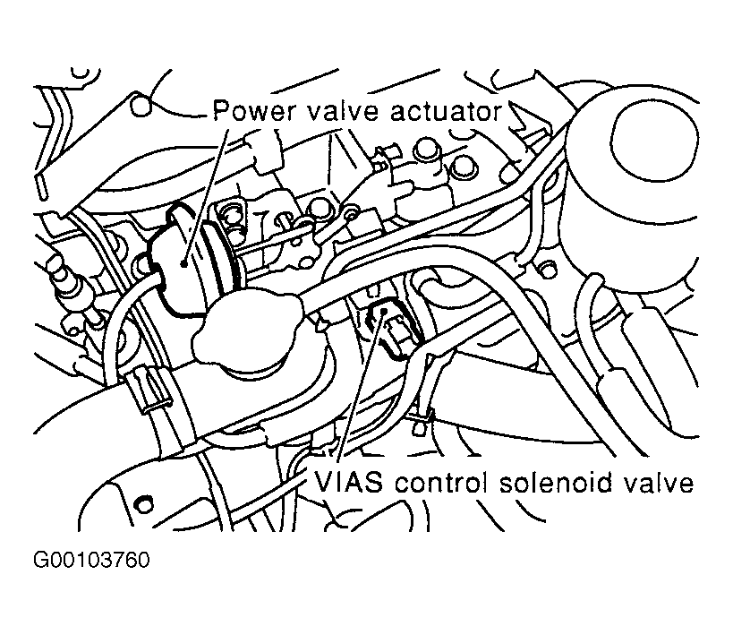 4. Stop engine, check hoses and tubes between intake manifold and power valve actuator for cracks, clogging, improper connection or disconnection. If no problem is found, go to next step. If problem is found, repair as necessary.