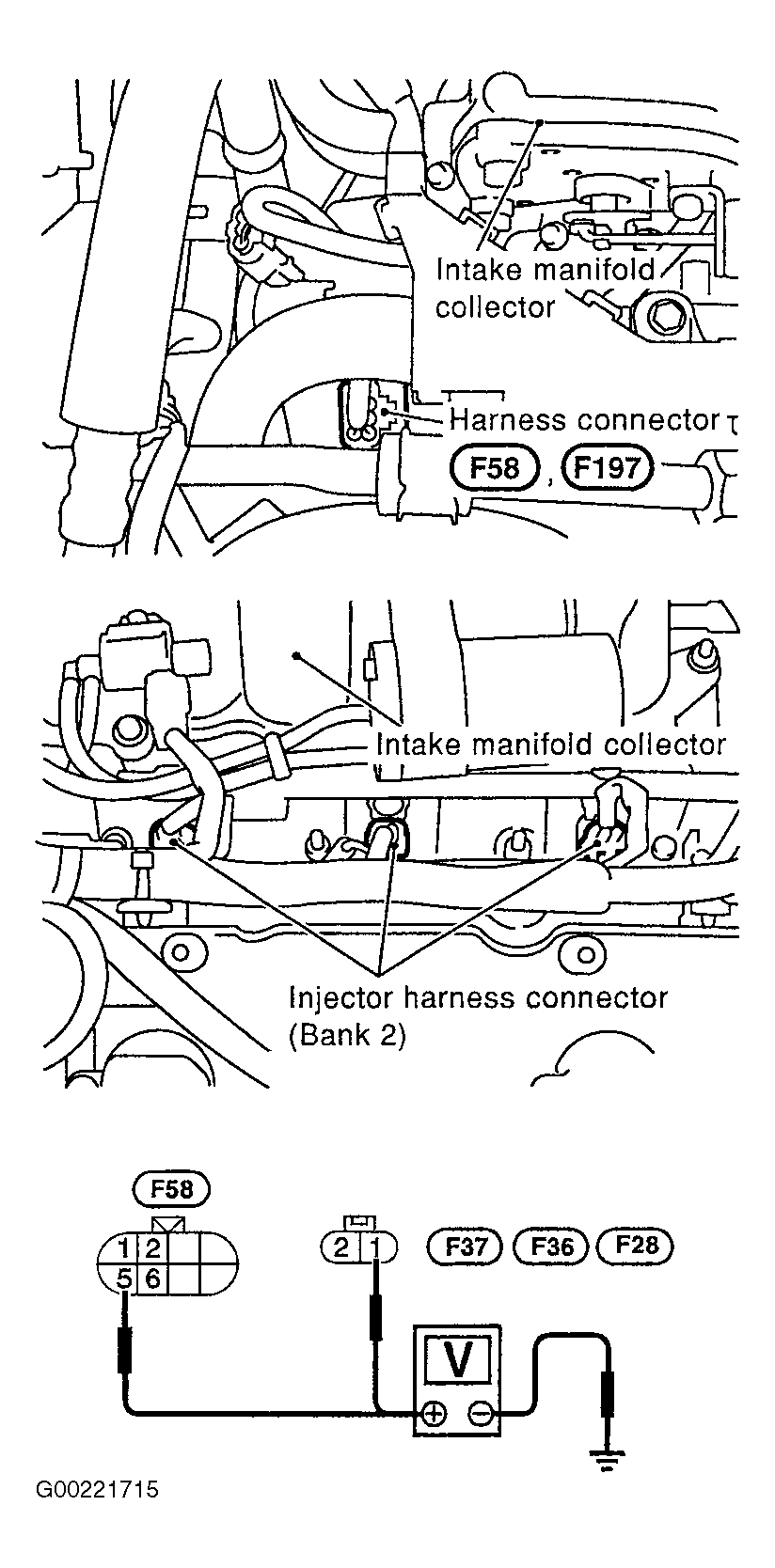 4. Turn ignition switch to OFF position. Disconnect fuel injector harness connector from bank No. 2. Also disconnect fuel injector harness connectors F58 and F197 from bank No. 1. See Fig 1. See ENGINE PERFORMANCE in SYSTEM WIRING DIAGRAMS article in ELECTRICAL. Turn ignition switch to ON position. Using voltmeter, check voltage between ground and fuel injector harness connector terminal No. 1. Also check voltage between ground and connector F58 terminal No. 5. Battery voltage should exist. If voltage is as specified, go to step  5. If voltage is not as specified, go to next step.
