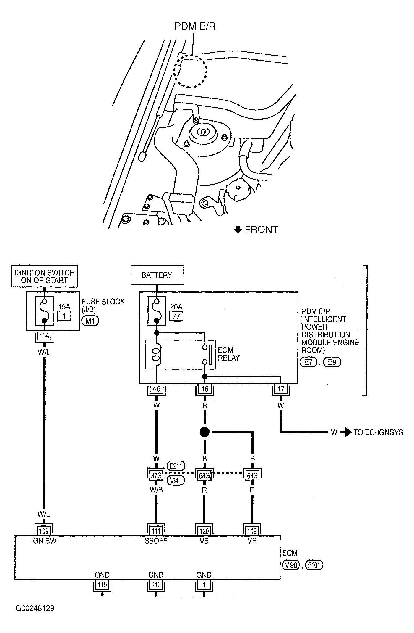 - Reconnect ECM harness connector. Turn ignition switch to ON position. Check voltage between ground and IPDM E/R connector E7 terminal No. 17. See Figure. Battery voltage should exist. If voltage is as specified, see appropriate IGNITION COIL & POWER TRANSISTOR test in IGNITION SIGNAL under IGNITION SYSTEM. If voltage is not as specified, go to next step.