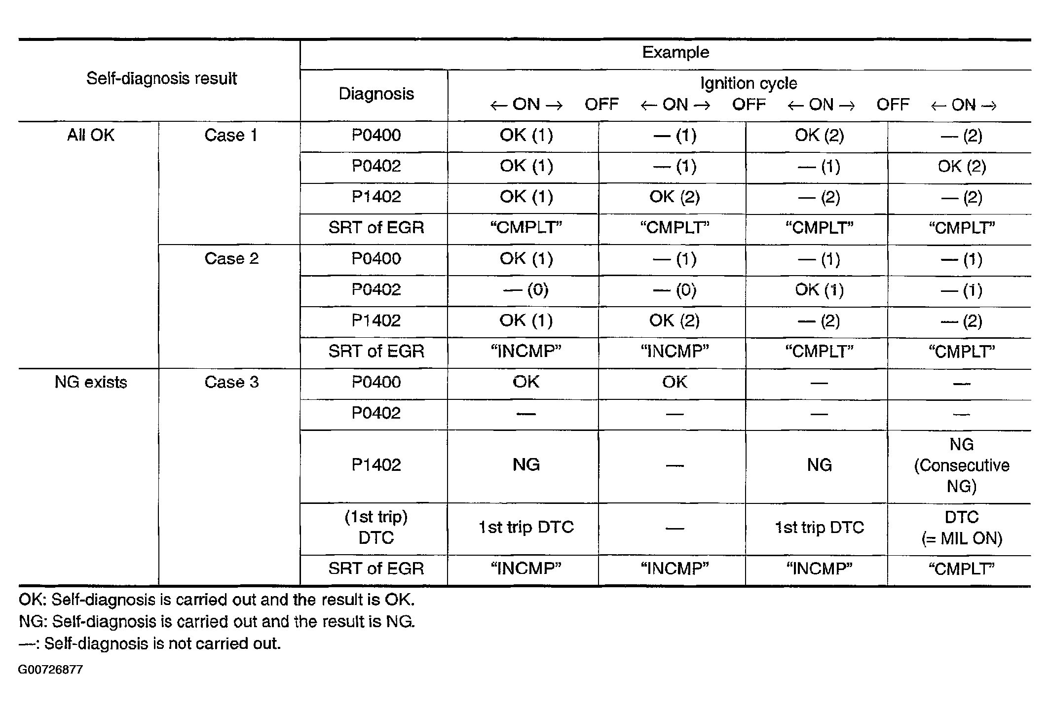 - When, during SRT driving pattern, 1st trip DTC (NG) is detected prior to CMPLT or SRT, the self-diagnosis memory must be erased from ECM after repair.