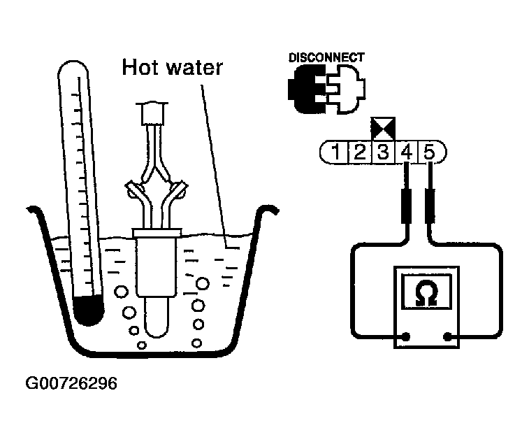 - Check resistance between fuel level sensor unit and fuel pump terminals 4 and 5, see Fig 1, by heating with hot water or heat gun as shown in Fig 2.