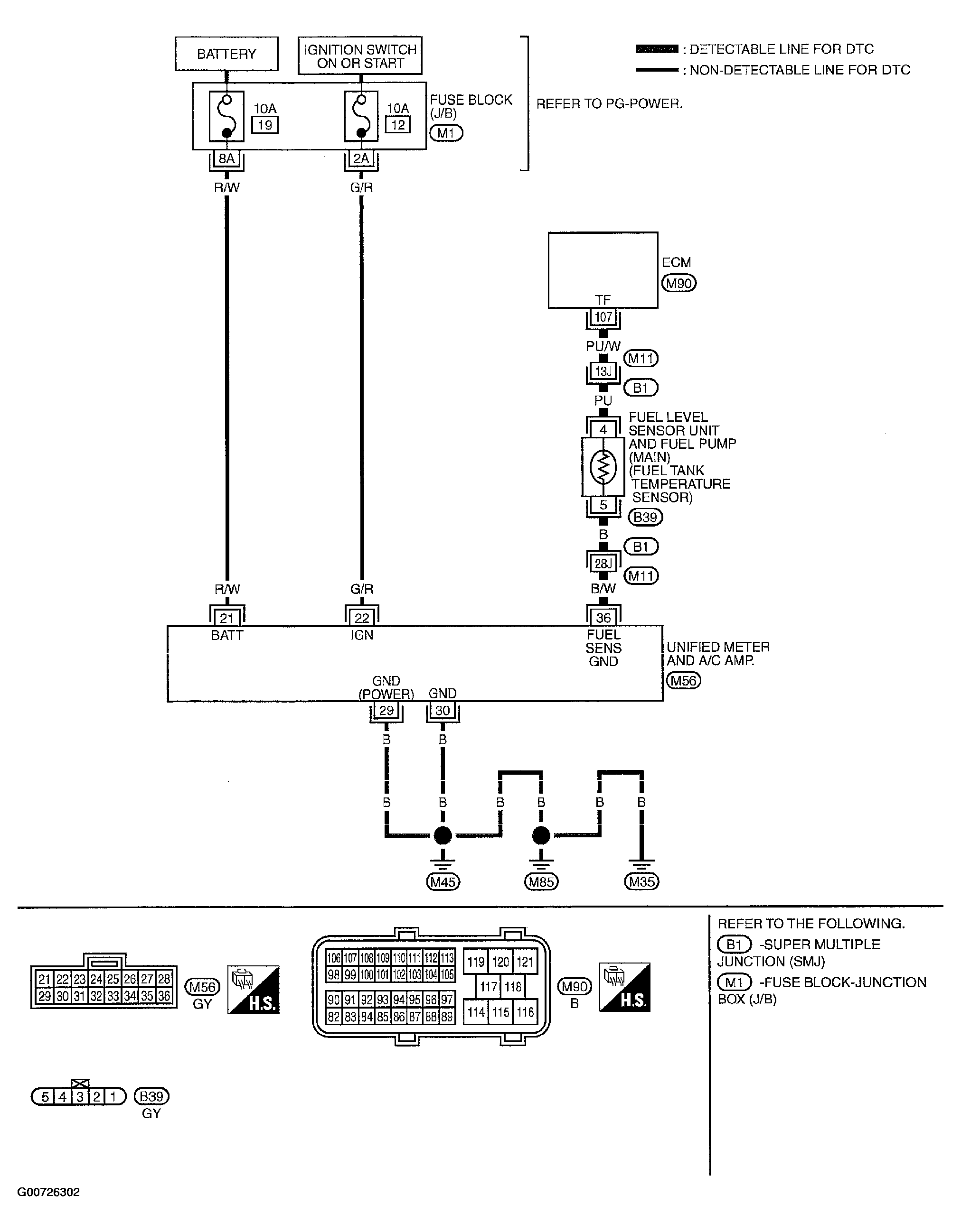 - Check harness continuity between fuel level sensor unit and fuel pump terminal 5 and unified meter and A/C amp. terminal 36. Refer to wiring diagram. See Figure.