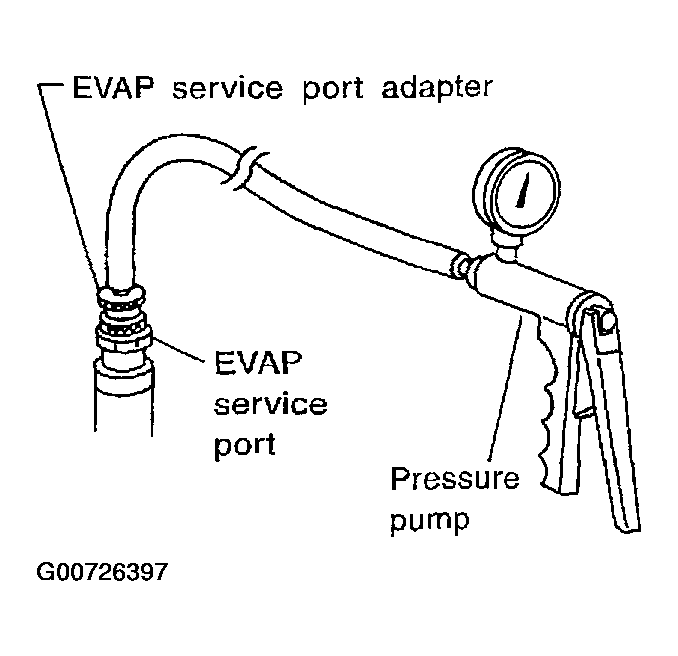 To locate the EVAP leak, install EVAP service port adapter and pressure pump to EVAP service port securely. See Figure and Fig 1. For the location of EVAP service port, Refer to EVAPORATIVE EMISSION LINE DRAWING .