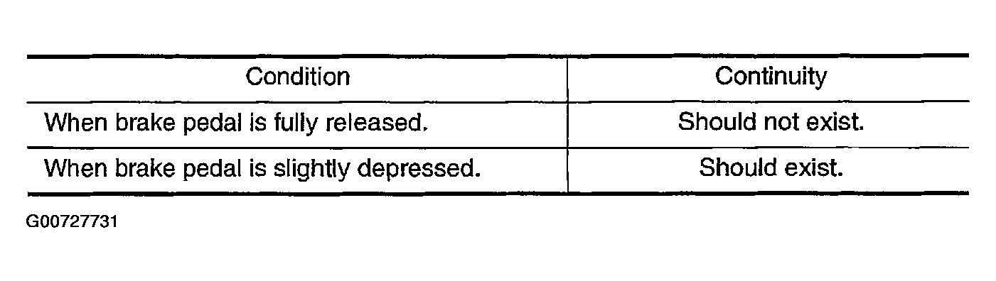 - Check continuity between stop lamp switch terminals 1 and 2 under the following conditions. See Figure and Figure.