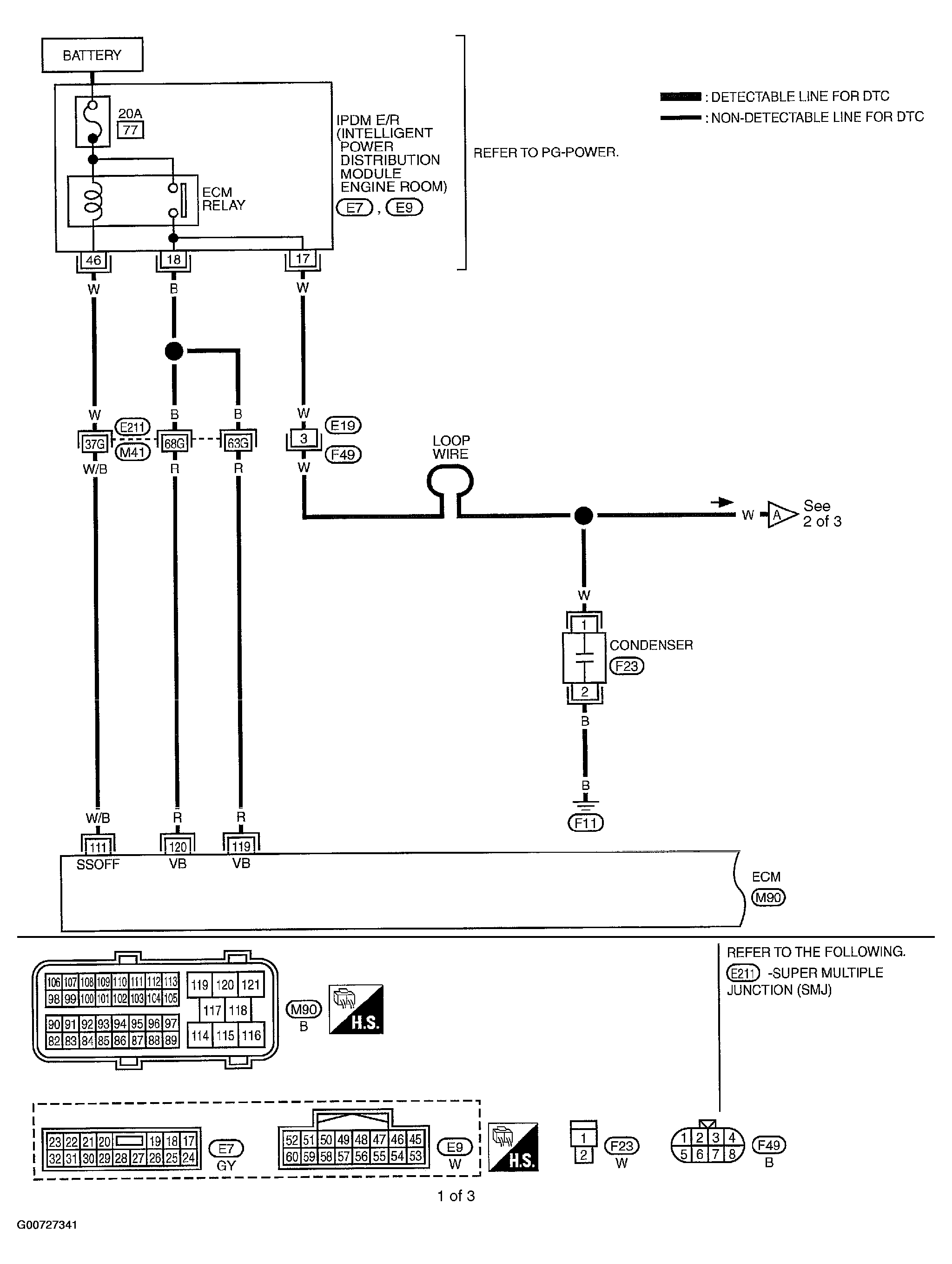 - Check harness continuity between IPDM E/R terminal 17 and condenser terminal 1.