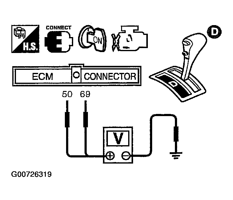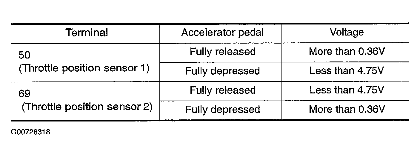 5. Check voltage between ECM terminals 50 (TP sensor 1 signal), 69 (TP sensor 2 signal), see Figure, and engine ground under the following conditions. See Figure.