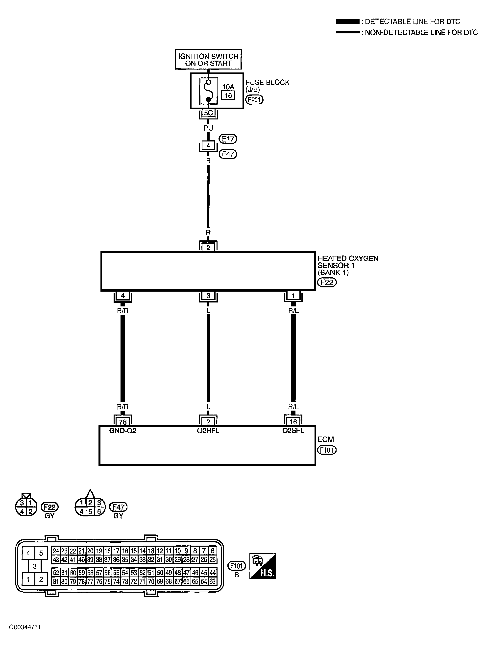 4. Check harness continuity between ECM terminal 16 and heated oxygen sensor 1 (bank 1) terminal 1.