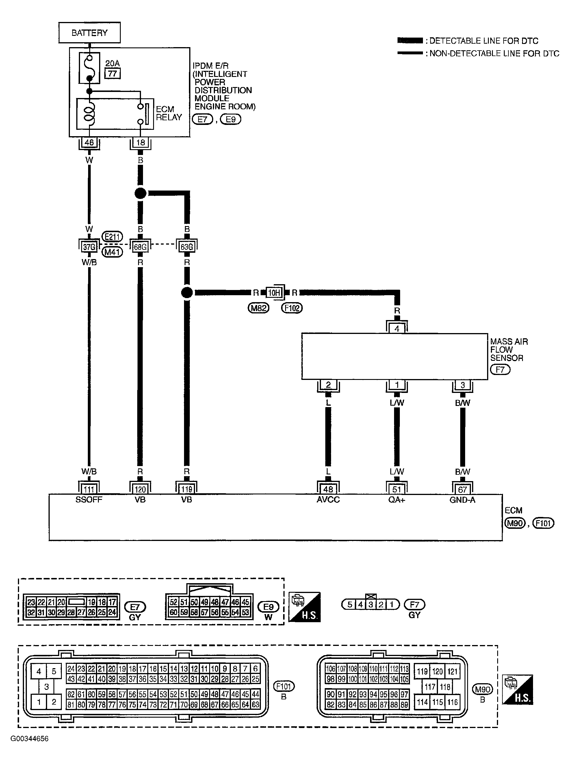 - Harness for open or short between IPDM E/R and mass air flow sensor