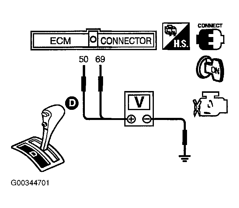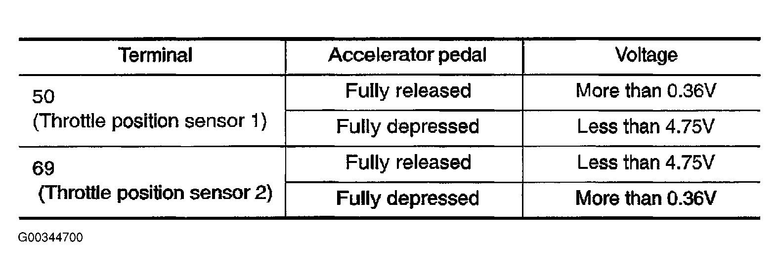 - Check voltage between ECM terminals 50 (TP sensor 1 signal), 69 (TP sensor 2 signal) and ground, see Fig 1 , under the following conditions, see Fig 2 .