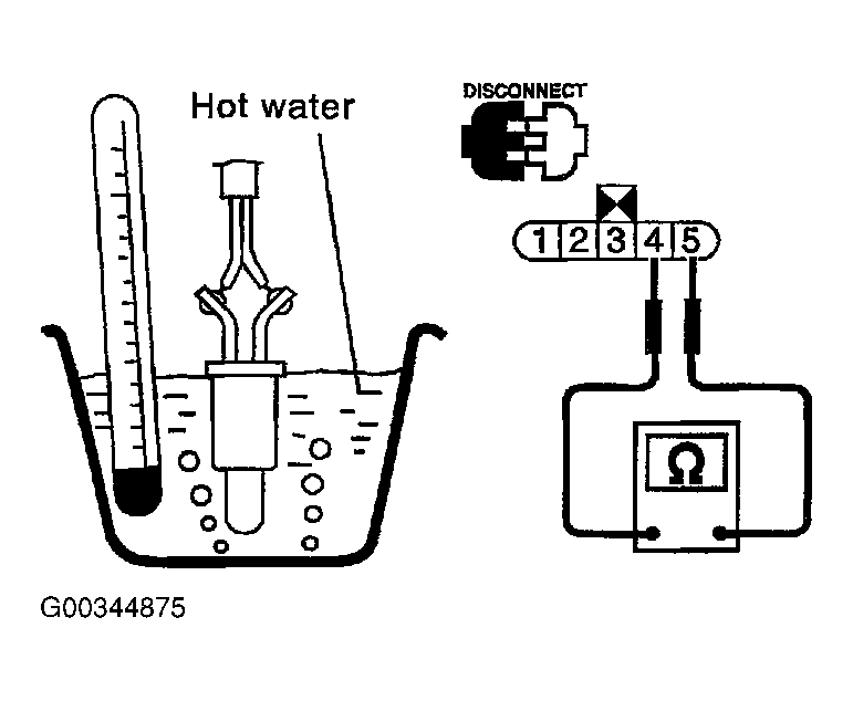 Check resistance between fuel level sensor unit and fuel pump terminals 4 and 5 by heating with hot water or heat gun as shown in