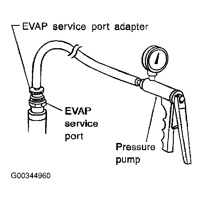 To locate the EVAP leak, install EVAP service port adapter and pressure pump to EVAP service port securely. See Figure . For EVAP service port location, see Figure . For the location of EVAP service port, Refer to EVAPORATIVE EMISSION LINE DRAWING .
