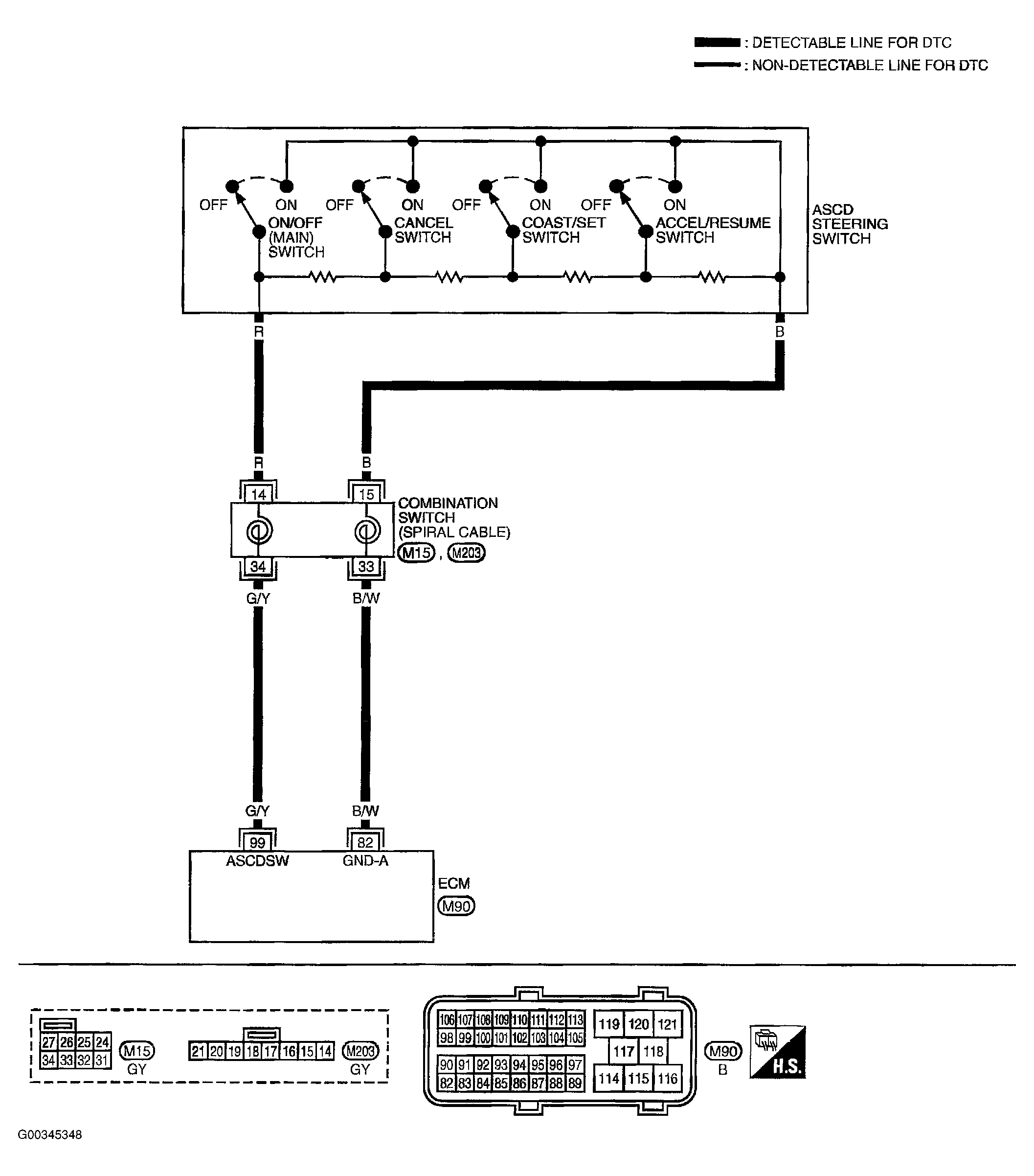 - Check harness continuity between ECM terminal 99 and combination switch terminal 14.