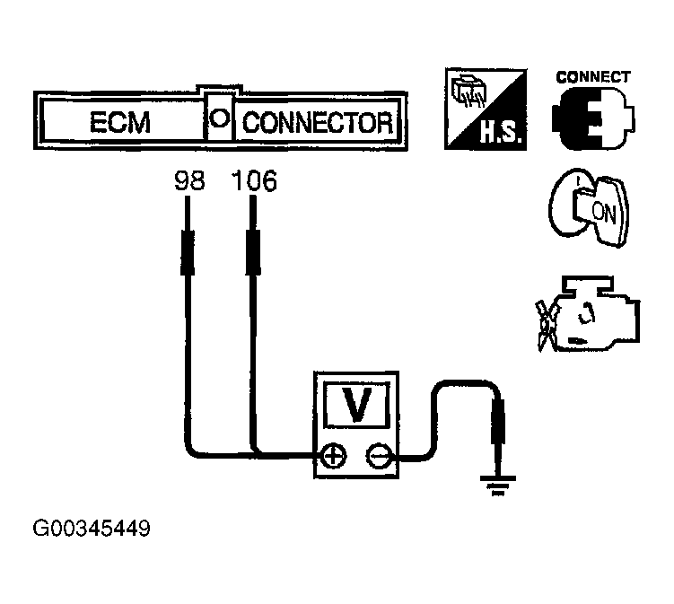 - Check voltage between ECM terminals 106 (APP sensor 1 signal), 98 (APP sensor 2 signal) and ground, see Figure , under the following conditions. See Figure .