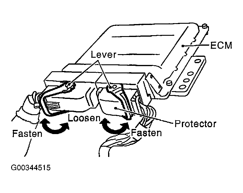 - When disconnecting ECM harness connector, loosen it with levers as far as they will go as shown in Fig 2