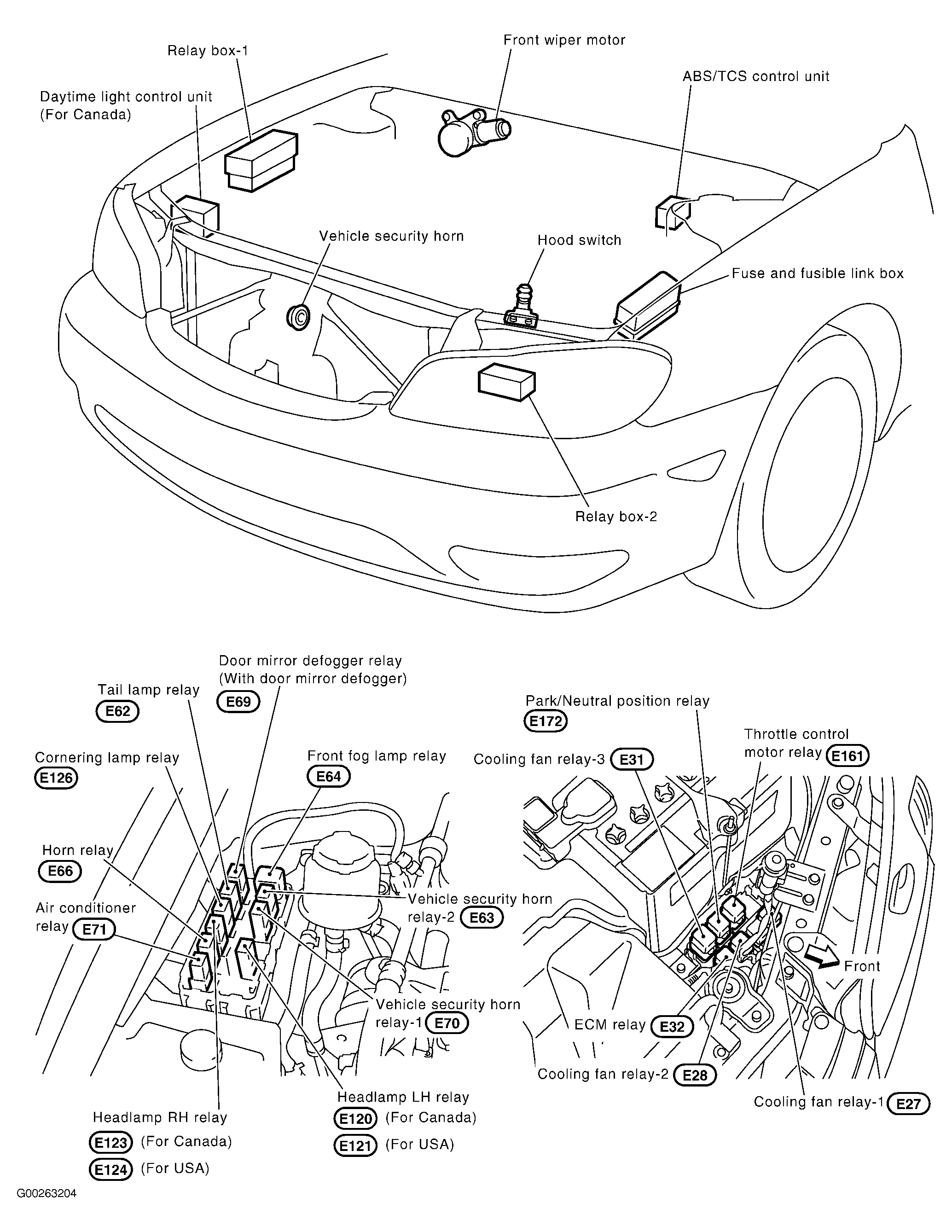 | Relay Box-2 | At left front corner of engine compartment. See Figure . |